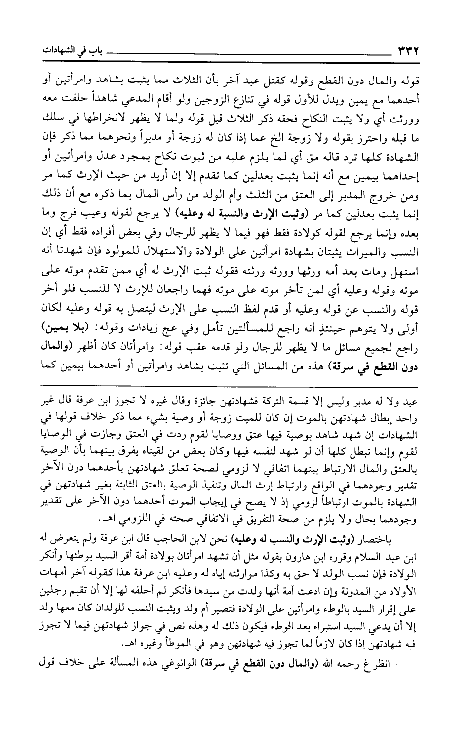 قوله والمال دون القطع وقوله كقتل عبد آخر بأن الثلاث مما يثبت بشاهد وامرأتين أو أحدهما مع يمين ويدل للأول قوله في تنازع الزوجين ولو أقام المدعي شاهدًا حلفت معه وورثت أي ولا يثبت النكاح فحقه ذكر الثلاث قبل قوله ولما لا يظهر لانخراطها في سلك ما قبله واحترز بقوله ولا زوجة الخ عما إذا كان له زوجة أو مدبرًا ونحوهما مما ذكر فإن الشهادة كلها ترد قاله مق أي لما يلزم عليه من ثبوت نكاح بمجرد عدل وامرأتين أو إحداهما بيمين مع أنه إنما يثبت بعدلين كما تقدم إلا إن أريد من حيث الإرث كما مر ومن خروج المدبر إلى العتق من الثلث وأم الولد من رأس المال بما ذكره مع أن ذلك إنما يثبت بعدلين كما مر (وثبت الإرث والنسبة له وعليه) لا يرجع لقوله وعيب فرج وما بعده وإنما يرجع لقوله كولادة فقط فهو فيما لا يظهر للرجال وفي بعض أفراده فقط أي إن النسب والميراث يثبتان بشهادة امرأتين على الولادة والاستهلال للمولود فإن شهدتا أنه استهل ومات بعد أمه ورثها وورثه ورثته فقوله ثبت الإرث له أي ممن تقدم موته على موته وقوله وعليه أي لمن تأخر موته على موته فهما راجعان للإرث لا للنسب فلو أخر قوله والنسب عن قوله وعليه أو قدم لفظ النسب على الإرث ليتصل به قوله وعليه لكان أولى ولا يتوهم حينئذٍ أنه راجع للمسألتين تأمل وفي عج زيادات وقوله: (بلا يمين) راجع لجميع مسائل ما لا يظهر للرجال ولو قدمه عقب قوله: وامرأتان كان أظهر (والمال دون القطع في سرقة) هذه من المسائل التي تثبت بشاهد وامرأتين أو أحدهما بيمين كما
