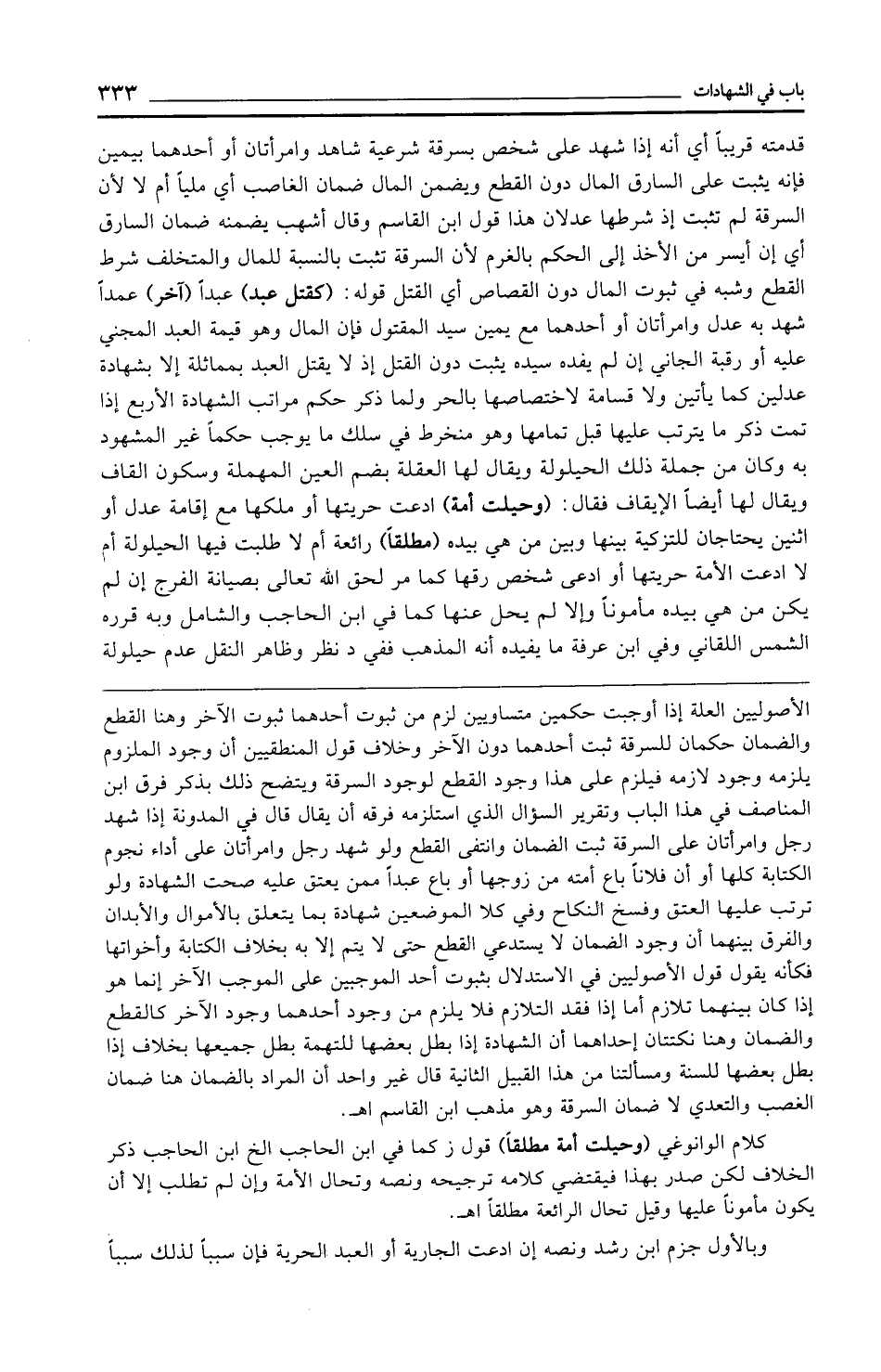 الأصوليين العلة إذا أوجبت حكمين متساويين لزم من ثبوت أحدهما ثبوت الآخر وهنا القطع والضمان حكمان للسرقة ثبت أحدهما دون الآخر وخلاف قول المنطقيين أن وجود الملزوم يلزمه وجود لازمه فيلزم على هذا وجود القطع لوجود السرقة ويتضح ذلك بذكر فرق ابن المناصف في هذا الباب وتقرير السؤال الذي استلزمه فرقه أن يقال قال في المدونة إذا شهد رجل وامرأتان على السرقة ثبت الضمان وانتفى القطع ولو شهد رجل وامرأتان على أداء نجوم الكتابة كلها أو أن فلانًا باع أمته من زوجها أو باع عبدًا ممن يعتق عليه صحت الشهادة ولو ترتب عليها العتق وفسخ النكاح وفي كلا الموضعين شهادة بما يتعلق بالأموال والأبدان والفرق بينهما أن وجود الضمان لا يستدعي القطع حتى لا يتم إلا به بخلاف الكتابة وأخواتها فكأنه يقول قول الأصوليين في الاستدلال بثبوت أحد الموجبين على الموجب الآخر إنما هو إذا كان بينهما تلازم أما إذا فقد التلازم فلا يلزم من وجود أحدهما وجود الآخر كالقطع والضمان وهنا نكتتان إحداهما أن الشهادة إذا بطل بعضها للتهمة بطل جميعها بخلاف إذا بطل بعضها للسنة ومسألتنا من هذا القبيل الثانية قال غير واحد أن المراد بالضمان هنا ضمان الغصب والتعدي لا ضمان السرقة وهو مذهب ابن القاسم اهـ.