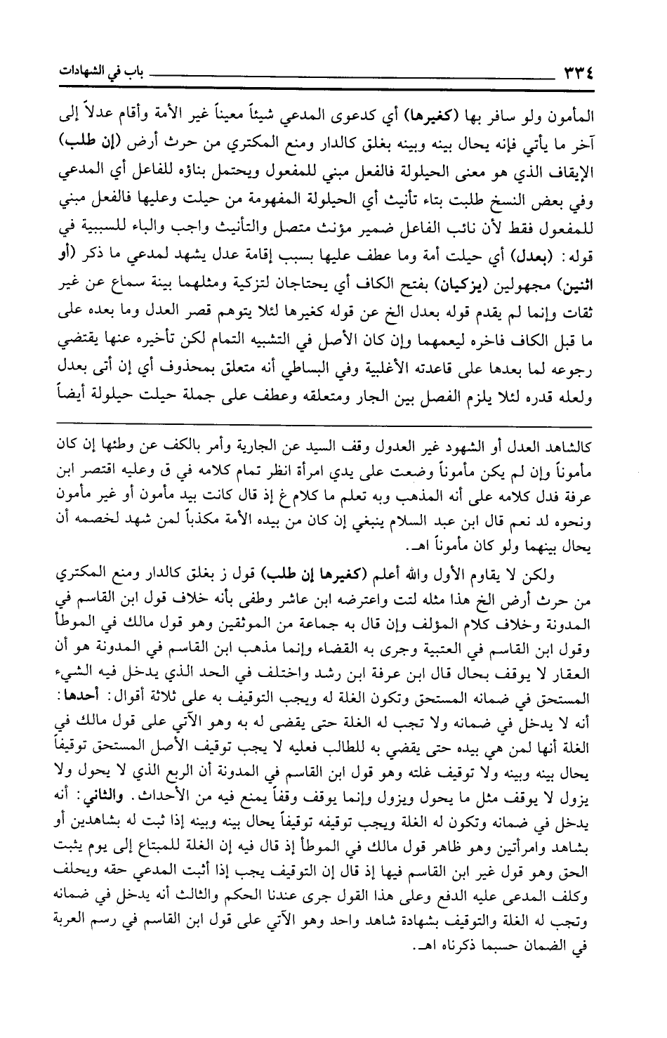 المأمون ولو سافر بها (كغيرها) أي كدعوى المدعي شيئًا معينًا غير الأمة وأقام عدلًا إلى آخر ما يأتي فإنه يحال بينه وبينه بغلق كالدار ومنع المكتري من حرث أرض (إن طلب) الإيقاف الذي هو معنى الحيلولة فالفعل مبني للمفعول ويحتمل بناؤه للفاعل أي المدعي وفي بعض النسخ طلبت بتاء تأنيث أي الحيلولة المفهومة من حيلت وعليها فالفعل مبني للمفعول فقط لأن نائب الفاعل ضمير مؤنث متصل والتأنيث واجب والباء للسببية في قوله: (بعدل) أي حيلت أمة وما عطف عليها بسبب إقامة عدل يشهد لمدعي ما ذكر (أو اثنين) مجهولين (يزكيان) بفتح الكاف أي يحتاجان لتزكية ومثلهما بينة سماع عن غير ثقات وإنما لم يقدم قوله بعدل الخ عن قوله كغيرها لئلا يتوهم قصر العدل وما بعده على ما قبل الكاف فأخره ليعمهما وإن كان الأصل في التشبيه التمام لكن تأخيره عنها يقتضي رجوعه لما بعدها على قاعدته الأغلبية وفي البساطي أنه متعلق بمحذوف أي إن أتى بعدل ولعله قدره لئلا يلزم الفصل بين الجار ومتعلقه وعطف على جملة حيلت حيلولة أيضًا
