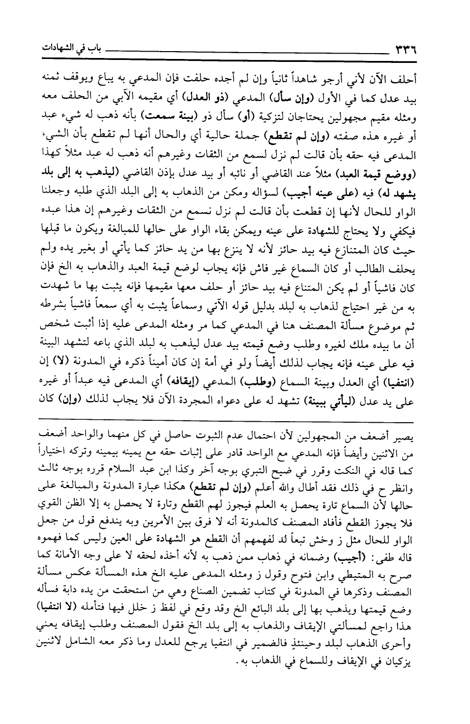 أحلف الآن لأني أرجو شاهدًا ثانيًا وإن لم أجده حلفت فإن المدعي به يباع ويوقف ثمنه بيد عدل كما في الأول (وإن سأل) المدعي (ذو العدل) أي مقيمه الآبي من الحلف معه ومثله مقيم مجهولين يحتاجان لتزكية (أو) سأل ذو (بينة سمعت) بأنه ذهب له شيء عبد أو غيره هذه صفته (وإن لم تقطع) جملة حالية أي والحال أنها لم تقطع بأن الشيء المدعى فيه حقه بأن قالت لم نزل لسمع من الثقات وغيرهم أنه ذهب له عبد مثلًا كهذا (ووضع قيمة العبد) مثلًا عند القاضي أو نائبه أو بيد عدل بإذن القاضي (ليذهب به إلى بلد يشهد له) فيه (على عينه أجيب) لسؤاله ومكن من الذهاب به إلى البلد الذي طلبه وجعلنا الواو للحال لأنها إن قطعت بأن قالت لم نزل نسمع من الثقات وغيرهم إن هذا عبده فيكفي ولا يحتاج للشهادة على عينه ويمكن بقاء الواو على حالها للمبالغة ويكون ما قبلها حيث كان المتنازع فيه بيد حائز لأنه لا ينزع بها من يد حائز كما يأتي أو بغير يده ولم يحلف الطالب أو كان السماع غير فاش فإنه يجاب لوضع قيمة العبد والذهاب به الخ فإن كان فاشيًا أو لم يكن المتناع فيه بيد حائز أو حلف معها مقيمها فإنه يثبت بها ما شهدت به من غير احتياج لذهاب به لبلد بدليل قوله الآتي وسماعًا يثبت به أي سمعًا فاشيًا بشرطه ثم موضوع مسألة المصنف هنا في المدعي كما مر ومثله المدعى عليه إذا أثبت شخص أن ما بيده ملك لغيره وطلب وضع قيمته بيد عدل ليذهب به لبلد الذي باعه لتشهد البينة فيه على عينه فإنه يجاب لذلك أيضًا ولو في أمة إن كان أمينًا ذكره في المدونة (لا) إن (انتفيا) أي العدل وبينة السماع (وطلب) المدعي (إيقافه) أي المدعى فيه عبدًا أو غيره على يد عدل (ليأتي ببينة) تشهد له على دعواه المجردة الآن فلا يجاب لذلك (وإن) كان