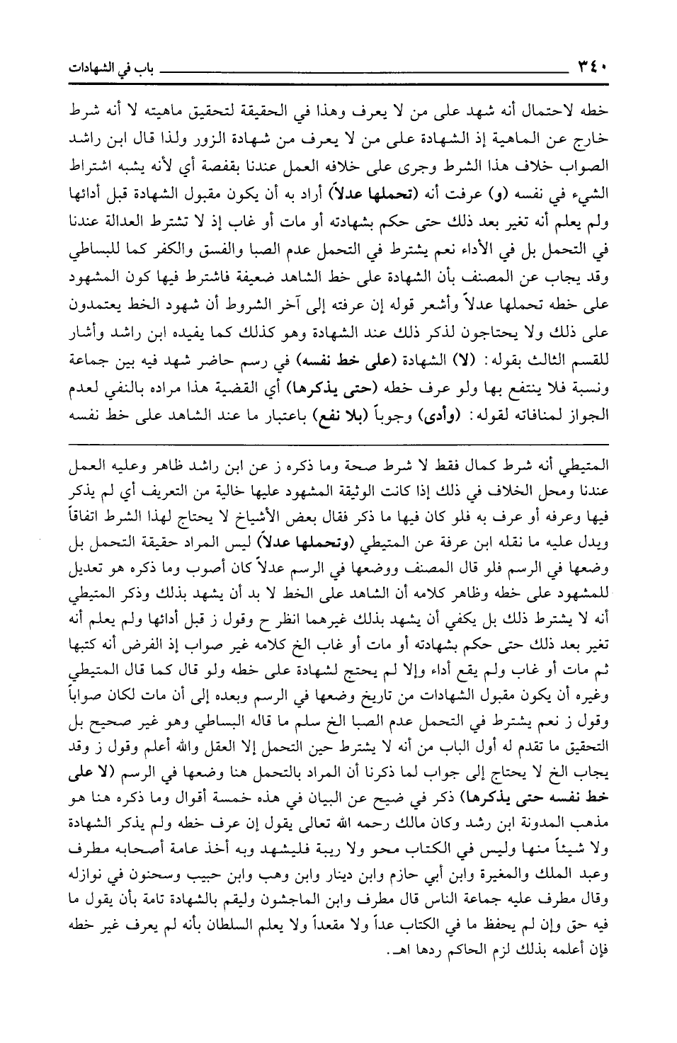 المتيطي أنه شرط كمال فقط لا شرط صحة وما ذكره ز عن ابن راشد ظاهر وعليه العمل عندنا ومحل الخلاف في ذلك إذا كانت الوثيقة المشهود عليها خالية من التعريف أي لم يذكر فيها وعرفه أو عرف به فلو كان فيها ما ذكر فقال بعض الأشياخ لا يحتاج لهذا الشرط اتفاقًا ويدل عليه ما نقله ابن عرفة عن المتيطي (وتحملها عدلًا) ليس المراد حقيقة التحمل بل وضعها في الرسم فلو قال المصنف ووضعها في الرسم عدلًا كان أصوب وما ذكره هو تعديل للمشهود على خطه وظاهر كلامه أن الشاهد على الخط لا بد أن يشهد بذلك وذكر المتيطي أنه لا يشترط ذلك بل يكفي أن يشهد بذلك غيرهما انظر ح وقول ز قبل أدائها ولم يعلم أنه تغير بعد ذلك حتى حكم بشهادته أو مات أو غاب الخ كلامه غير صواب إذ الفرض أنه كتبها ثم مات أو غاب ولم يقع أداء وإلا لم يحتج لشهادة على خطه ولو قال كما قال المتيطي وغيره أن يكون مقبول الشهادات من تاريخ وضعها في الرسم وبعده إلى أن مات لكان صوابًا وقول ز نعم يشترط في التحمل عدم الصبا الخ سلم ما قاله البساطي وهو غير صحيح بل التحقيق ما تقدم له أول الباب من أنه لا يشترط حين التحمل إلا العقل والله أعلم وقول ز وقد يجاب الخ لا يحتاج إلى جواب لما ذكرنا أن المراد بالتحمل هنا وضعها في الرسم (لا على خط نفسه حتى يذكرها) ذكر في ضيح عن البيان في هذه خمسة أقوال وما ذكره هنا هو مذهب المدونة ابن رشد وكان مالك رحمه الله تعالى يقول إن عرف خطه ولم يذكر الشهادة ولا شيئًا منها وليس في الكتاب محو ولا ريبة فليشهد وبه أخذ عامة أصحابه مطرف وعبد الملك والمغيرة وابن أبي حازم وابن دينار وابن وهب وابن حبيب وسحنون في نوازله وقال مطرف عليه جماعة الناس قال مطرف وابن الماجشون وليقم بالشهادة تامة بأن يقول ما فيه حق وإن لم يحفظ ما في الكتاب عدًّا ولا مقعدًا ولا يعلم السلطان بأنه لم يعرف غير خطه فإن أعلمه بذلك لزم الحاكم ردها اهـ.