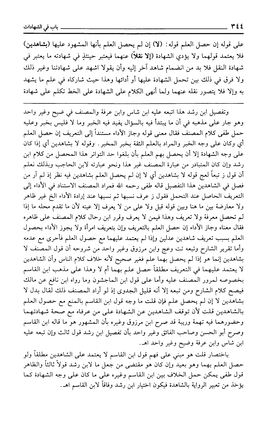 باختصار قلت هو مبني على فهم قول ابن القاسم لا يعتمد على الشاهدين مطلقًا ولو حصل العلم بهما وهو بعيد وإن كان هو مقتضى من جعل ما لابن رشد قولًا ثالثًا والظاهر قول طفى يمكن حمل الخلاف بين ابن القاسم وغيره على ما كان على وجه الشهادة كما يؤخذ من تعبير الرواية بالشاهدة فيكون اختيار ابن رشد وفاقًا لابن القاسم اهـ.