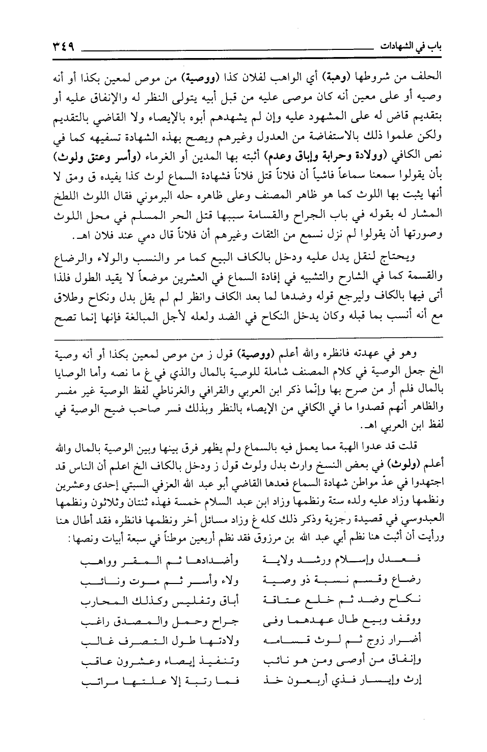 قلت قد عدوا الهبة مما يعمل فيه بالسماع ولم يظهر فرق بينها وبين الوصية بالمال والله أعلم (ولوث) في بعض النسخ وارث بدل ولوث قول ز ودخل بالكاف الخ اعلم أن الناس قد اجتهدوا في عدّ مواطن شهادة السماع فعدها القاضي أبو عبد الله العزفي السبتي إحدى وعشرين ونظمها وزاد عليه ولده ستة ونظمها وزاد ابن عبد السلام خمسة فهذه ثنتان وثلاثون ونظمها العبدوسي في قصيدة رجزية وذكر ذلك كله غ وزاد مسائل أخر ونظمها فانظره فقد أطال هنا ورأيت أن أثبت هنا نظم أبي عبد الله بن مرزوق فقد نظم أربعين موطنًا في سبعة أبيات ونصها: