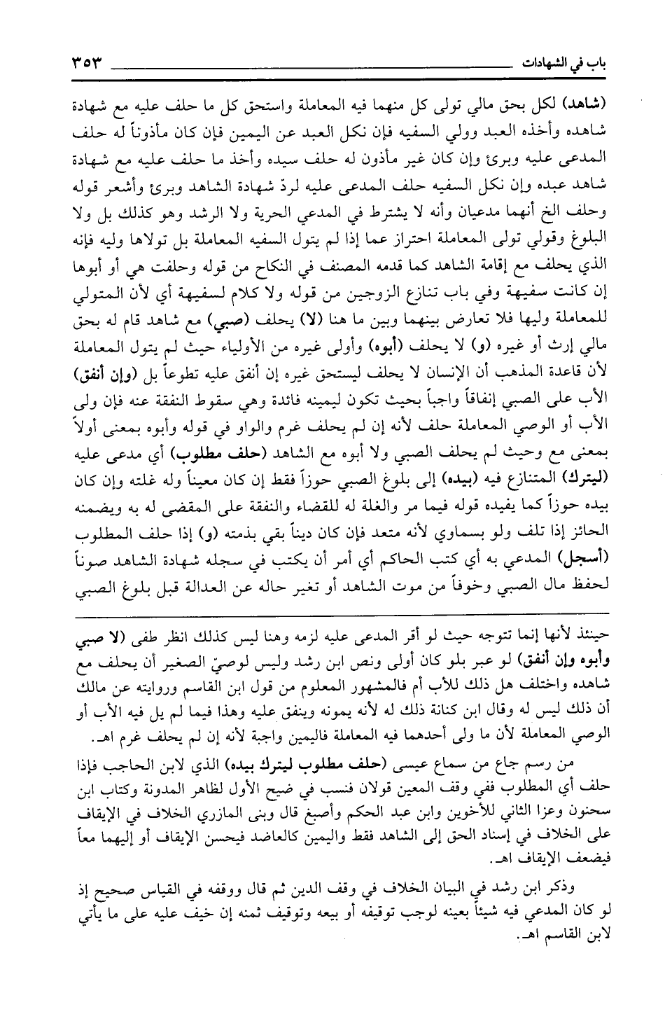 من رسم جاع من سماع عيسى (حلف مطلوب ليترك بيده) الذي لابن الحاجب فإذا حلف أي المطلوب ففي وقف المعين قولان فنسب في ضيح الأول لظاهر المدونة وكتاب ابن سحنون وعزا الثاني للأخوين وابن عبد الحكم وأصبغ قال وبنى المازري الخلاف في الإيقاف على الخلاف في إسناد الحق إلى الشاهد فقط واليمين كالعاضد فيحسن الإيقاف أو إليهما معًا فيضعف الإيقاف اهـ.