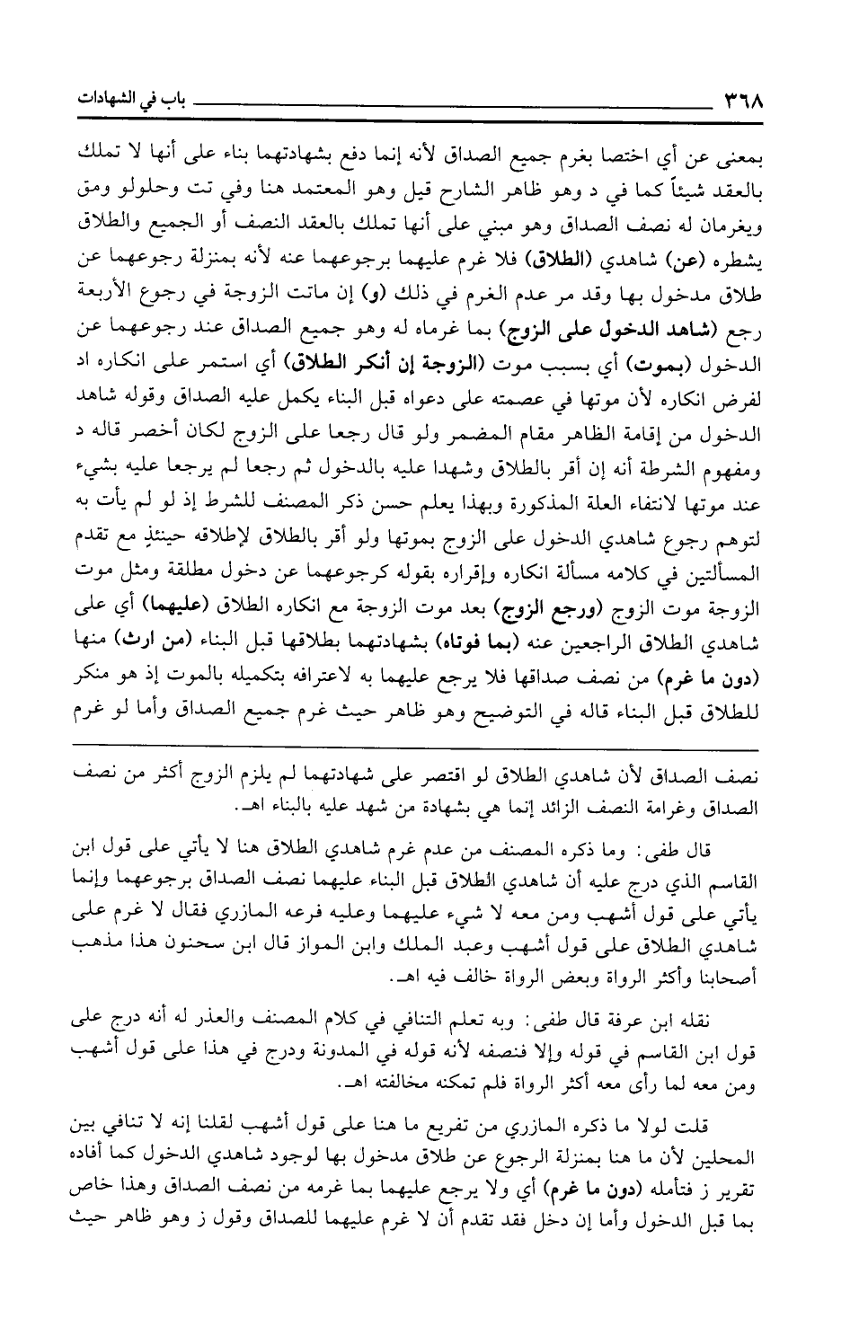 قال طفى: وما ذكره المصنف من عدم غرم شاهدي الطلاق هنا لا يأتي على قول ابن القاسم الذي درج عليه أن شاهدي الطلاق قبل البناء عليهما نصف الصداق برجوعهما وإنما يأتي على قول أشهب ومن معه لا شيء عليهما وعليه فرعه المازري فقال لا غرم على شاهدي الطلاق على قول أشهب وعبد الملك وابن المواز قال ابن سحنون هذا مذهب أصحابنا وأكثر الرواة وبعض الرواة خالف فيه اهـ.