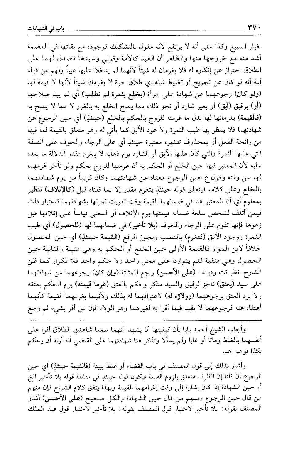 خيار المبيع وكذا على أنه لا يرتفع لأنه مقول بالتشكيك فوجوده مع بقائها في العصمة أشد منه مع خروجها منها والظاهر أن العبد كالأمة وقولي وسيدها مصدق لهما على الطلاق احتراز عن إنكاره له فلا يغرمان له شيئًا لأنهما لم يدخلا عليها عيبًا وفهم من قوله أمة أنه لو كان عن تجريح أو تغليط شاهدي طلاق حرة لا يغرمان شيئًا لأنها لا قيمة لها (ولو كان) رجوعهما عن شهادة على امرأة (بخلع بثمرة لم تطلب) أي لم يبد صلاحها (أو) برقيق (آبق) أو بعير شارد أو نحو ذلك مما يصح الخلع به بالغرر لا مما لا يصح به (فالقيمة) يغرمانها لها بدل ما غرمته للزوج بالحكم بالخلع (حينئذٍ) أي حين الرجوع عن شهادتهما فلا ينتظر بها طيب الثمرة ولا عود الآبق كما يأتي له وهو متعلق بالقيمة لما فيها من رائحة الفعل أو بمحذوف تقديره معتبرة حينئذٍ أي على الرجاء والخوف على الصفة التي عليها الثمرة والتي كان عليها الآبق أو الشارد يوم ذهابه لا بيغرم مقدر الدلالة ما بعده عليه لأن المعتبر فيها حين الخلع أو الحكم به أن غرمتها للزوج بحكم ولو تأخر غرمهما لها عن وقته وقول غ حين الرجوع معناه عن شهادتهما وكان قريبًا من يوم شهادتهما بالخلع وعلى كلامه فيتعلق قوله حينئذٍ بتغرم مقدر إلا بما قلناه قبل (كالإتلاف) تنظير بمعلوم أي أن المعتبر هنا في ضمانهما القيمة وقت تفويت ثمرتها بشهادتهما كاعتبار ذلك فيمن أتلف لشخص سلعة ضمانه قيمتها يوم الإتلاف أو المعنى قياسًا على إتلافها قبل زهوها فإنها تقوم على الرجاء والخوف (بلا تأخير) في ضمانهما لها (للحصول) أي طيب الثمرة ووجود الآبق (فتغرم) بالنصب ويجوز الرفع (القيمة حينئذٍ) أي حين الحصول خلافًا لابن المواز فالقيمة الأولى حين الخلع أو الحكم به وهي مثبتة والثانية حين الحصول وهي منفية فلم يتواردا على محل واحد ولا حكم واحد فلا تكرار كما ظن الشارح انظر تت وقوله: (على الأحسن) راجع للمثبتة (وإن كان) رجوعهما عن شهادتهما على سيد (بعتق) ناجز لرقيق والسيد منكر وحكم بالعتق (غرما قيمته) يوم الحكم بعتقه ولا يرد العتق برجوعهما (وولاؤه له) لاعترافهما له بذلك ولأنهما بغرمهما القيمة كأنهما أعتقاه عنه فرجوعهما لا يفيد فيما أقرا به لغيرهما وهو الولاء فإن من أقر بشيء ثم رجع