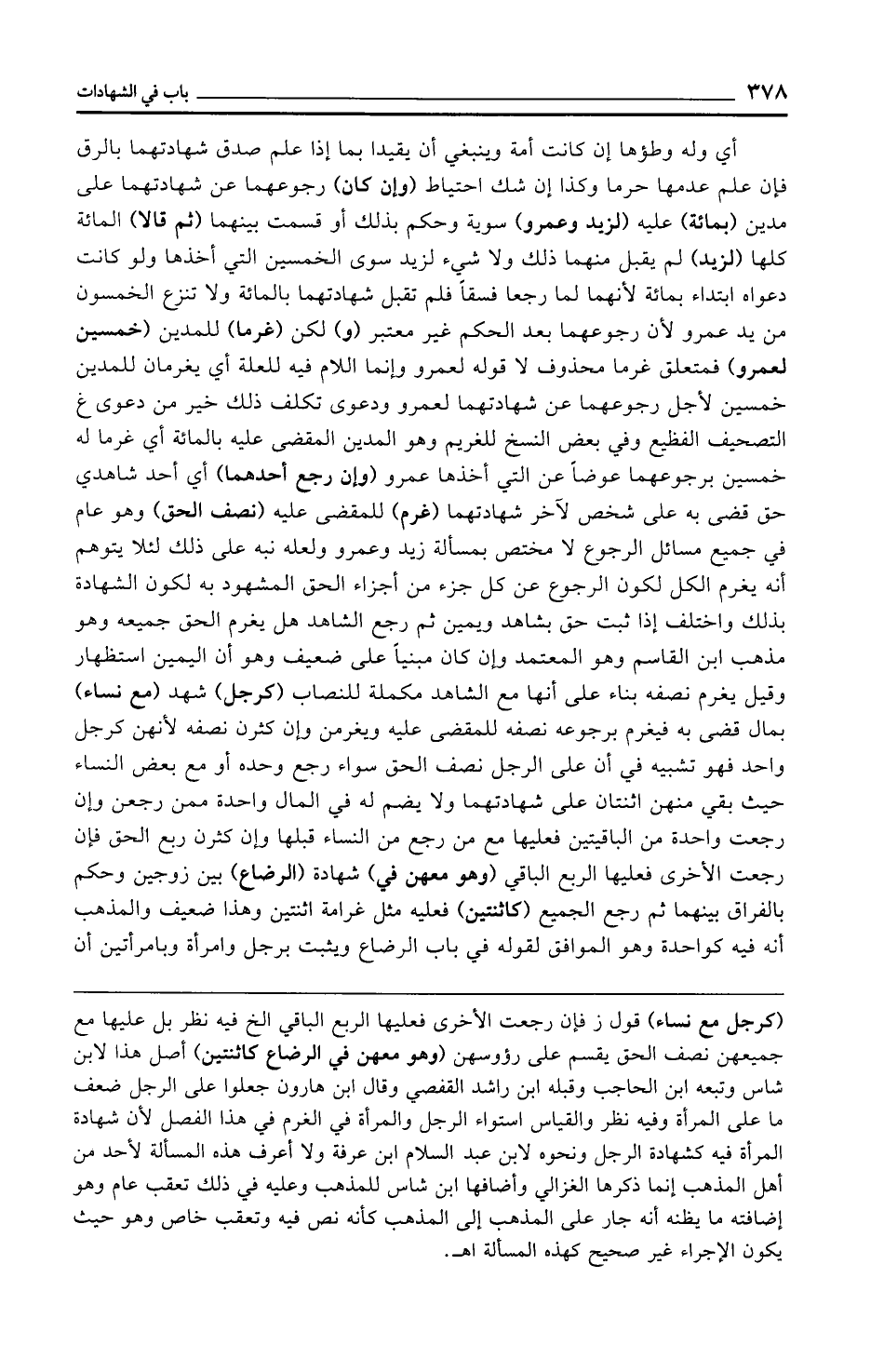 (كرجل مع نساء) قول ز فإن رجعت الأخرى فعليها الربع الباقي الخ فيه نظر بل عليها مع جميعهن نصف الحق يقسم على رؤوسهن (وهو معهن في الرضاع كاثنتين) أصل هذا لابن شاس وتبعه ابن الحاجب وقبله ابن راشد القفصي وقال ابن هارون جعلوا على الرجل ضعف ما على المرأة وفيه نظر والقياس استواء الرجل والمرأة في الغرم في هذا الفصل لأن شهادة المرأة فيه كشهادة الرجل ونحوه لابن عبد السلام ابن عرفة ولا أعرف هذه المسألة لأحد من أهل المذهب إنما ذكرها الغزالي وأضافها ابن شاس للمذهب وعليه في ذلك تعقب عام وهو إضافته ما يظنه أنه جار على المذهب إلى المذهب كأنه نص فيه وتعقب خاص وهو حيث يكون الإجراء غير صحيح كهذه المسألة اهـ.