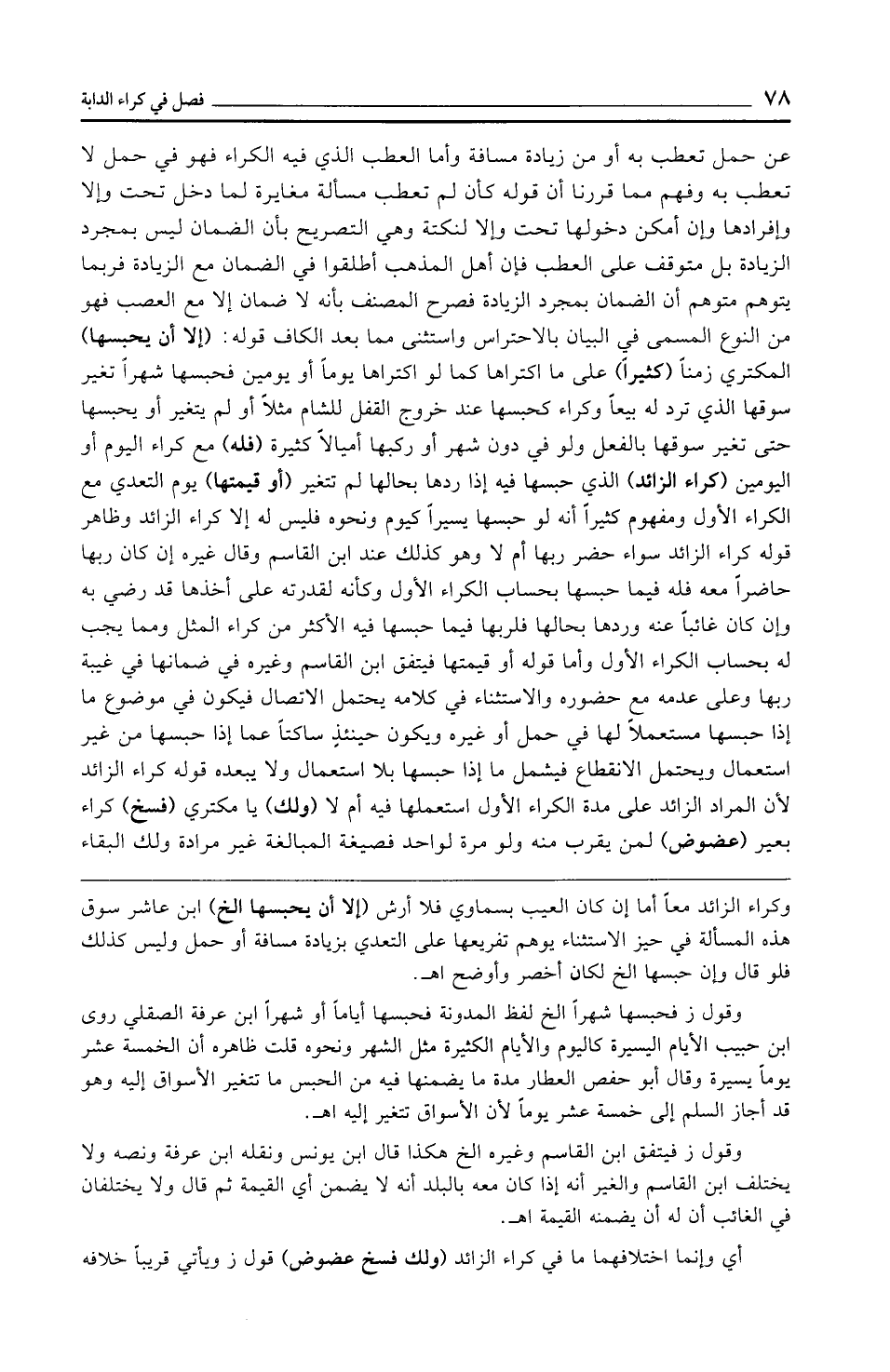 وكراء الزائد معًا أما إن كان العيب بسماوي فلا أرش (إلا أن يحبسها الخ) ابن عاشر سوق هذه المسألة في حيز الاستثناء يوهم تفريعها على التعدي بزيادة مسافة أو حمل وليس كذلك فلو قال وإن حبسها الخ لكان أخصر وأوضح اهـ.