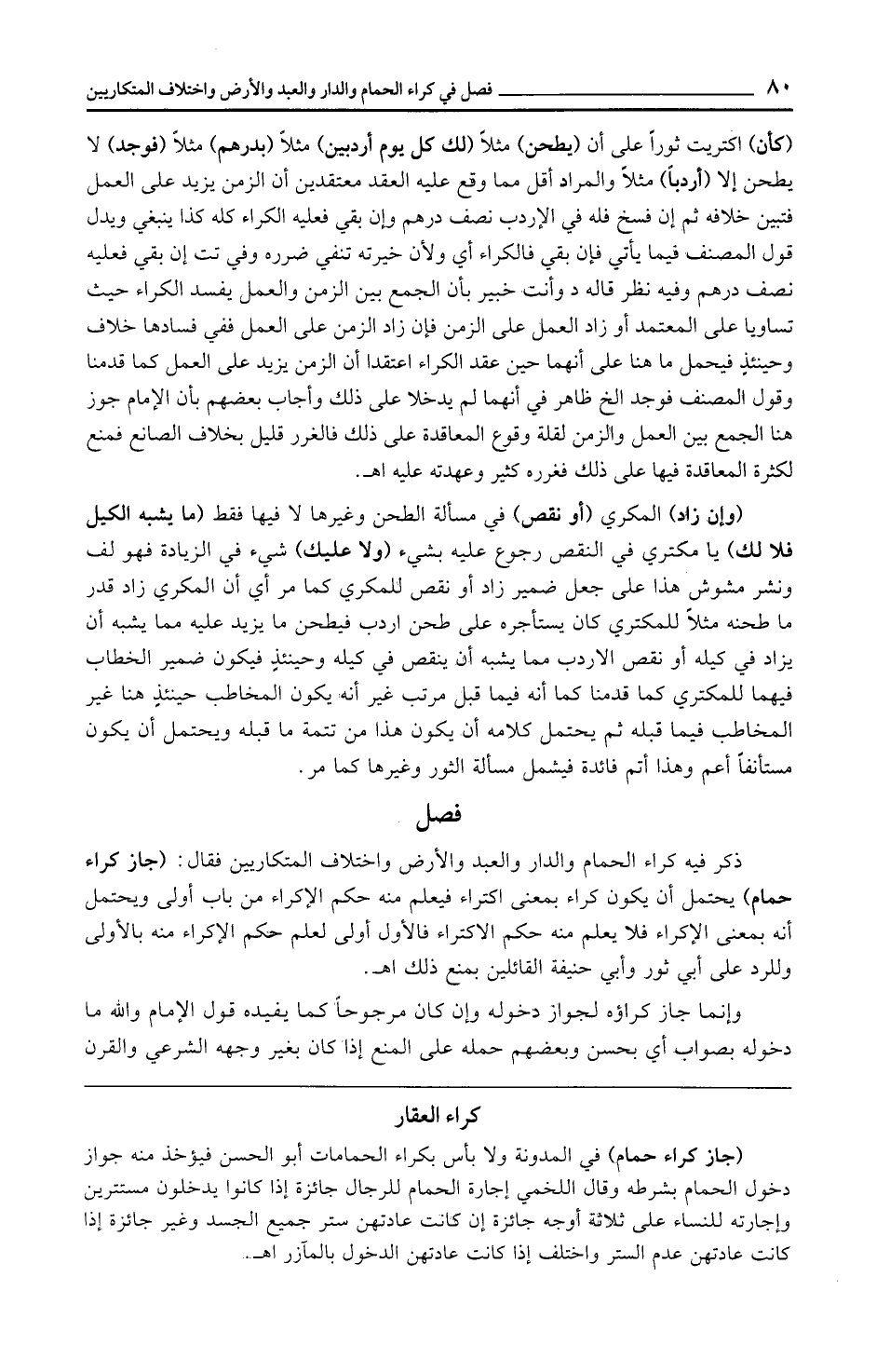 ذكر فيه كراء الحمام والدار والعبد والأرض واختلاف المتكاريين فقال: (جاز كراء حمام) يحتمل أن يكون كراء بمعنى اكتراء فيعلم منه حكم الإكراء من باب أولى ويحتمل أنه بمعنى الإكراء فلا يعلم منه حكم الاكتراء فالأول أولى لعلم حكم الإكراء منه بالأولى وللرد على أبي ثور وأبي حنيفة القائلين بمنع ذلك اهـ.