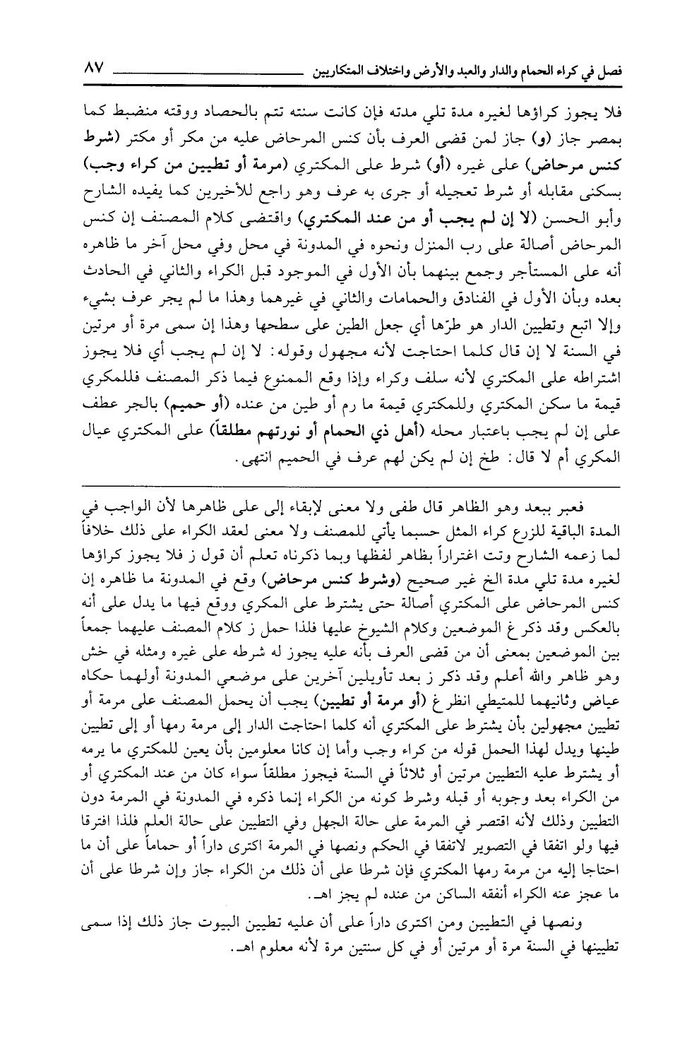 فلا يجوز كراؤها لغيره مدة تلي مدته فإن كانت سنته تتم بالحصاد ووقته منضبط كما بمصر جاز (و) جاز لمن قضى العرف بأن كنس المرحاض عليه من مكر أو مكتر (شرط كنس مرحاض) على غيره (أو) شرط على المكتري (مرمة أو تطيين من كراء وجب) بسكنى مقابله أو شرط تعجيله أو جرى به عرف وهو راجع للأخيرين كما يقيده الشارح وأبو الحسن (لا إن لم يجب أو من عند المكتري) واقتضى كلام المصنف إن كنس المرحاض أصالة على رب المنزل ونحوه في المدونة في محل وفي محل آخر ما ظاهره أنه على المستأجر وجمع بينهما بأن الأول في الموجود قبل الكراء والثاني في الحادث بعده وبأن الأول في الفنادق والحمامات والثاني في غيرهما وهذا ما لم يجر عرف بشيء وإلا اتبع وتطيين الدار هو طرّها أي جعل الطين على سطحها وهذا إن سمى مرة أو مرتين في السنة لا إن قال كما احتاجت لأنه مجهول وقوله: لا إن لم يجب أي فلا يجوز اشتراطه على المكتري لأنه سلف وكراء وإذا وقع الممنوع فيما ذكر المصنف فللمكري قيمة ما سكن المكتري وللمكتري قيمة ما رم أو طين من عنده (أو حميم) بالجر عطف على إن لم يجب باعتبار محله (أهل ذي الحمام أو نورتهم مطلقًا) على المكتري عيال المكري أم لا قال: طخ إن لم يكن لهم عرف في الحميم انتهى.