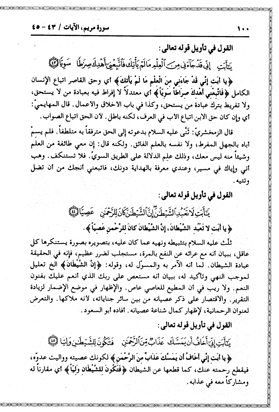 يا أَبَتِ لا تَعْبُدِ الشَّيْطانَ، إِنَّ الشَّيْطانَ كانَ لِلرَّحْمنِ عَصِيًّا.