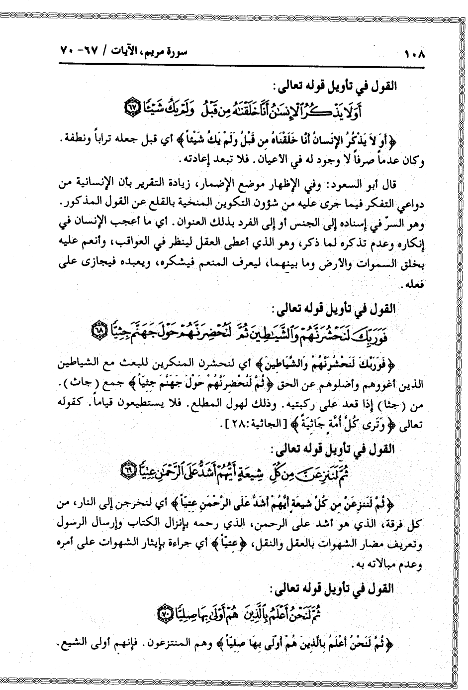 ثُمَّ لَنَنْزِعَنَّ مِنْ كُلِّ شِيعَةٍ أَيُّهُمْ أَشَدُّ عَلَى الرَّحْمنِ عِتِيًّا أي لنخرجن إلى النار، من كل فرقة، الذي هو أشد على الرحمن، الذي رحمه بإنزال الكتاب وإرسال الرسول وتعريف مضار الشهوات بالعقل والنقل، عِتِيًّا أي جراءة بإيثار الشهوات على أمره وعدم مبالاته به.