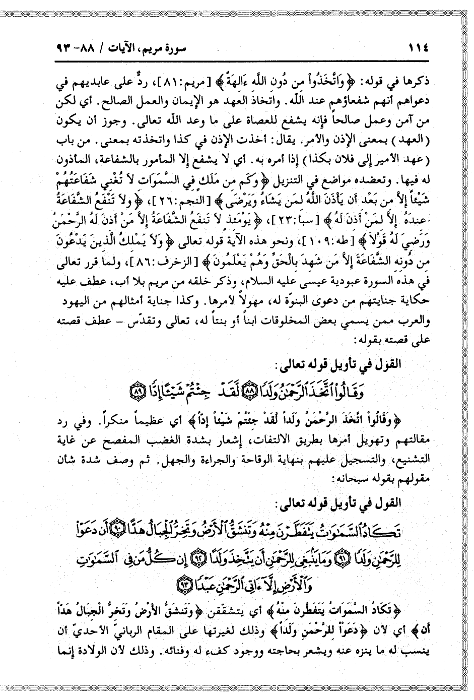 تَكادُ السَّماواتُ يَتَفَطَّرْنَ مِنْهُ وَتَنْشَقُّ الْأَرْضُ وَتَخِرُّ الْجِبالُ هَدًّا (90) أَنْ دَعَوْا لِلرَّحْمنِ وَلَداً (91) وَما يَنْبَغِي لِلرَّحْمنِ أَنْ يَتَّخِذَ وَلَداً (92) إِنْ كُلُّ مَنْ فِي السَّماواتِ وَالْأَرْضِ إِلاَّ آتِي الرَّحْمنِ عَبْداً (93)