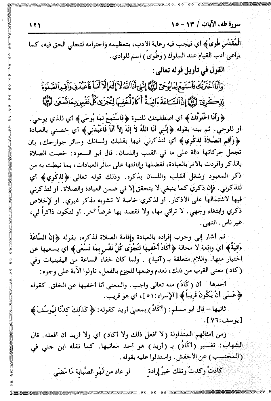 وَأَنَا اخْتَرْتُكَ فَاسْتَمِعْ لِما يُوحى (13) إِنَّنِي أَنَا اللَّهُ لا إِلهَ إِلاَّ أَنَا فَاعْبُدْنِي وَأَقِمِ الصَّلاةَ لِذِكْرِي (14) إِنَّ السَّاعَةَ آتِيَةٌ أَكادُ أُخْفِيها لِتُجْزى كُلُّ نَفْسٍ بِما تَسْعى (15)