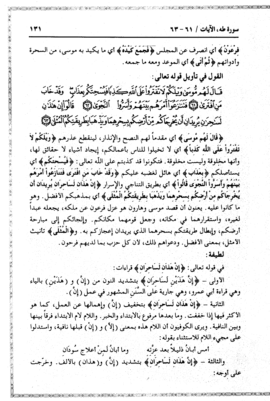 الثانية- إِنْ هذانِ لَساحِرانِ بتخفيف (إنّ) وإهمالها عن العمل، كما هو الأكثر فيها إذا خففت. وما بعدها مرفوع بالابتداء والخبر. واللام لام الابتداء فرقا بينها وبين النافية. ويرى الكوفيون أن اللام هذه بمعنى (إلّا) و (إن) قبلها نافية، واستدلوا على مجيء اللام للاستثناء بقوله: