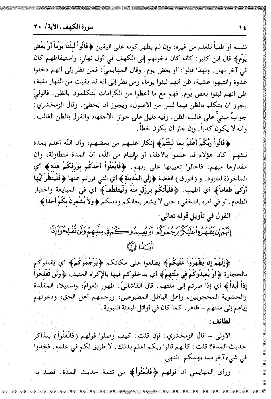 قالُوا رَبُّكُمْ أَعْلَمُ بِما لَبِثْتُمْ إنكار عليهم من بعضهم، وأن الله أعلم بمدة لبثهم. كأن هؤلاء قد علموا بالأدلة، أو بإلهام من الله، أن المدة متطاولة، وأن مقدارها مبهم. فأحالوا تعيينها على ربهم. فَابْعَثُوا أَحَدَكُمْ بِوَرِقِكُمْ هذِهِ أي المأخوذة للتزود. و (الورق) الفضة إِلَى الْمَدِينَةِ أي التي فررتم عنها فَلْيَنْظُرْ أَيُّها أَزْكى طَعاماً أي أطيب. فَلْيَأْتِكُمْ بِرِزْقٍ مِنْهُ وَلْيَتَلَطَّفْ أي في المبايعة واختيار الطعام. أو في أمره بالتخفي، حتى لا يشعر بحالكم ودينكم وَلا يُشْعِرَنَّ بِكُمْ أَحَداً.