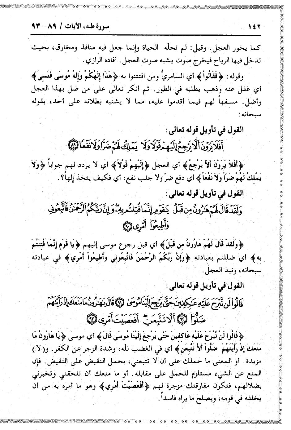 قالُوا لَنْ نَبْرَحَ عَلَيْهِ عاكِفِينَ حَتَّى يَرْجِعَ إِلَيْنا مُوسى (91) قالَ يا هارُونُ ما مَنَعَكَ إِذْ رَأَيْتَهُمْ ضَلُّوا (92) أَلاَّ تَتَّبِعَنِ أَفَعَصَيْتَ أَمْرِي (93)