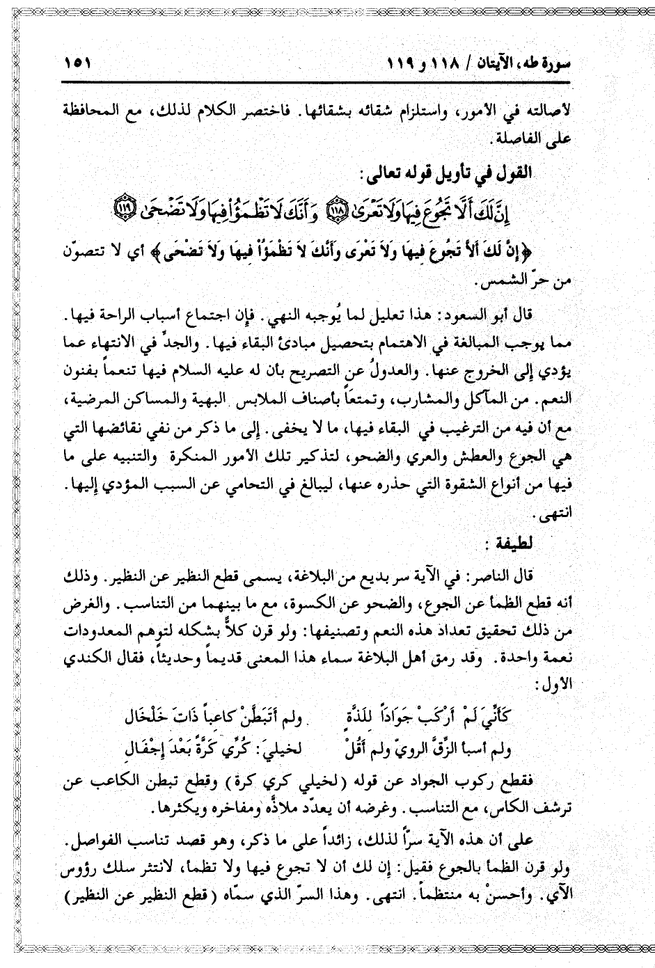 قال الناصر: في الآية سر بديع من البلاغة، يسمى قطع النظير عن النظير. وذلك أنه قطع الظمأ عن الجوع، والضحو عن الكسوة، مع ما بينهما من التناسب. والغرض من ذلك تحقيق تعداد هذه النعم وتصنيفها: ولو قرن كلّا بشكله لتوهم المعدودات نعمة واحدة. وقد رمق أهل البلاغة سماء هذا المعنى قديما وحديثا، فقال الكندي الأول: