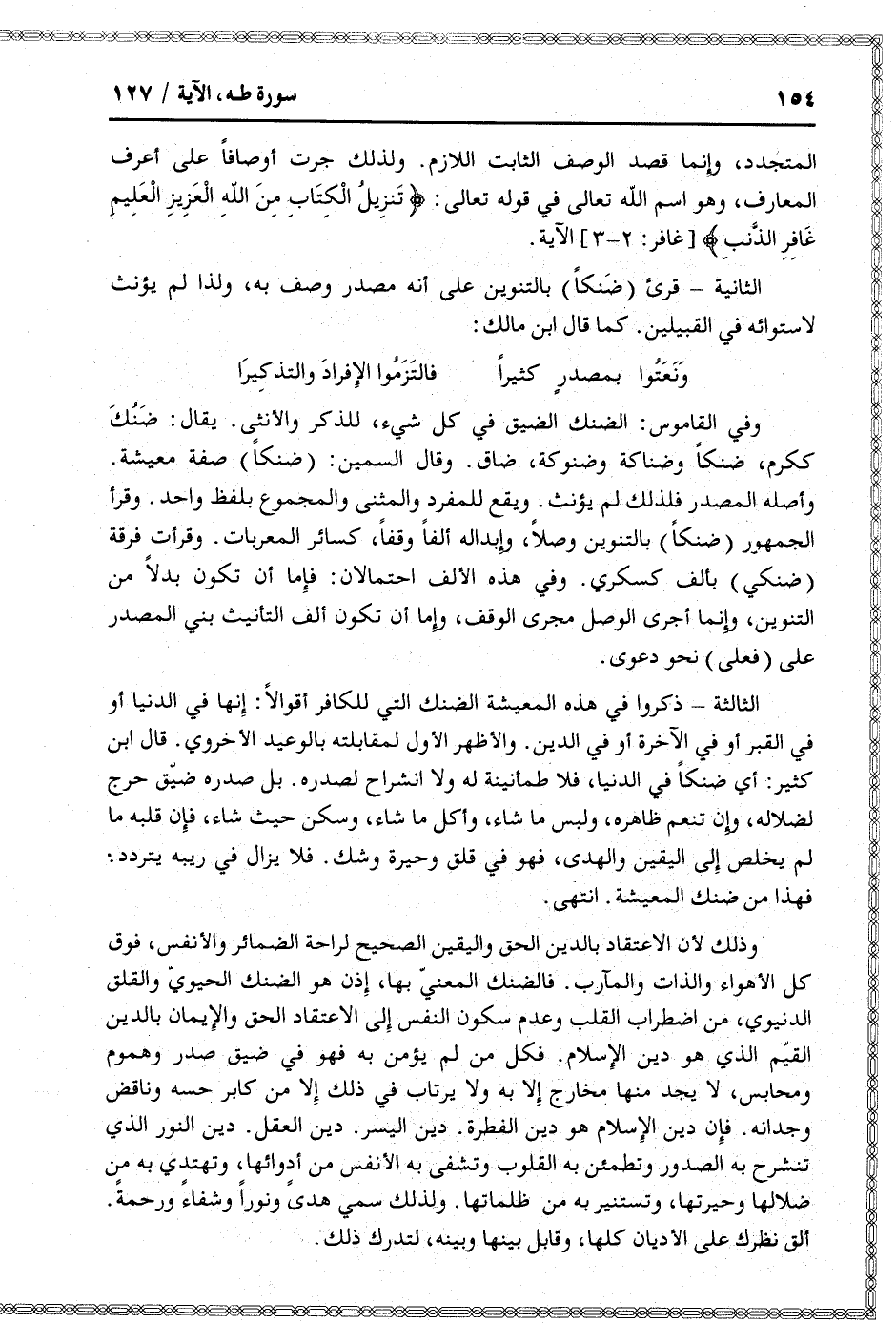 وذلك لأن الاعتقاد بالدين الحق واليقين الصحيح لراحة الضمائر والأنفس، فوق كل الأهواء والذات والمآرب. فالضنك المعنيّ بها، إذن هو الضنك الحيويّ والقلق الدنيوي، من اضطراب القلب وعدم سكون النفس إلى الاعتقاد الحق والإيمان بالدين القيّم الذي هو دين الإسلام. فكل من لم يؤمن به فهو في ضيق صدر وهموم ومحابس، لا يجد منها مخارج إلا به ولا يرتاب في ذلك إلا من كابر حسه وناقض وجدانه. فإن دين الإسلام هو دين الفطرة. دين اليسر. دين العقل. دين النور الذي تنشرح به الصدور وتطمئن به القلوب وتشفى به الأنفس من أدوائها، وتهتدي به من ضلالها وحيرتها، وتستنير به من ظلماتها. ولذلك سمي هدى ونورا وشفاء ورحمة.