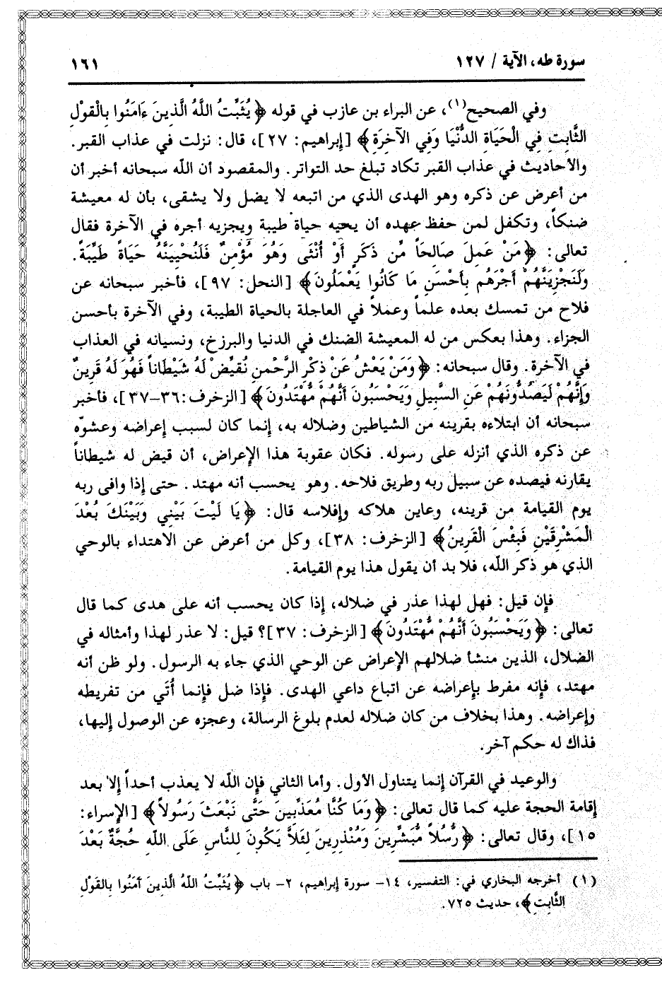 والأحاديث في عذاب القبر تكاد تبلغ حد التواتر. والمقصود أن الله سبحانه أخبر أن من أعرض عن ذكره وهو الهدى الذي من اتبعه لا يضل ولا يشقى، بأن له معيشة ضنكا، وتكفل لمن حفظ عهده أن يحيه حياة طيبة ويجزيه أجره في الآخرة فقال تعالى: مَنْ عَمِلَ صالِحاً مِنْ ذَكَرٍ أَوْ أُنْثى وَهُوَ مُؤْمِنٌ فَلَنُحْيِيَنَّهُ حَياةً طَيِّبَةً. وَلَنَجْزِيَنَّهُمْ أَجْرَهُمْ بِأَحْسَنِ ما كانُوا يَعْمَلُونَ [النحل: 97] ، فأخبر سبحانه عن فلاح من تمسك بعده علما وعملا في العاجلة بالحياة الطيبة، وفي الآخرة بأحسن الجزاء. وهذا بعكس من له المعيشة الضنك في الدنيا والبرزخ، ونسيانه في العذاب في الآخرة. وقال سبحانه: وَمَنْ يَعْشُ عَنْ ذِكْرِ الرَّحْمنِ نُقَيِّضْ لَهُ شَيْطاناً فَهُوَ لَهُ قَرِينٌ وَإِنَّهُمْ لَيَصُدُّونَهُمْ عَنِ السَّبِيلِ وَيَحْسَبُونَ أَنَّهُمْ مُهْتَدُونَ [الزخرف: 36- 37] ، فأخبر سبحانه أن ابتلاءه بقرينه من الشياطين وضلاله به، إنما كان لسبب إعراضه وعشوه عن ذكره الذي أنزله على رسوله. فكان عقوبة هذا الإعراض، أن قيض له شيطانا يقارنه فيصده عن سبيل ربه وطريق فلاحه. وهو يحسب أنه مهتد. حتى إذا وافى ربه يوم القيامة من قرينه، وعاين هلاكه وإفلاسه قال: يا لَيْتَ بَيْنِي وَبَيْنَكَ بُعْدَ الْمَشْرِقَيْنِ فَبِئْسَ الْقَرِينُ [الزخرف: 38] ، وكل من أعرض عن الاهتداء بالوحي الذي هو ذكر الله، فلا بد أن يقول هذا يوم القيامة.