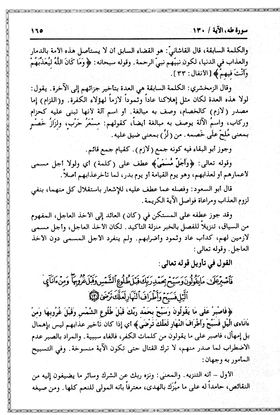فَاصْبِرْ عَلى ما يَقُولُونَ وَسَبِّحْ بِحَمْدِ رَبِّكَ قَبْلَ طُلُوعِ الشَّمْسِ وَقَبْلَ غُرُوبِها وَمِنْ آناءِ اللَّيْلِ فَسَبِّحْ وَأَطْرافَ النَّهارِ لَعَلَّكَ تَرْضى (130)