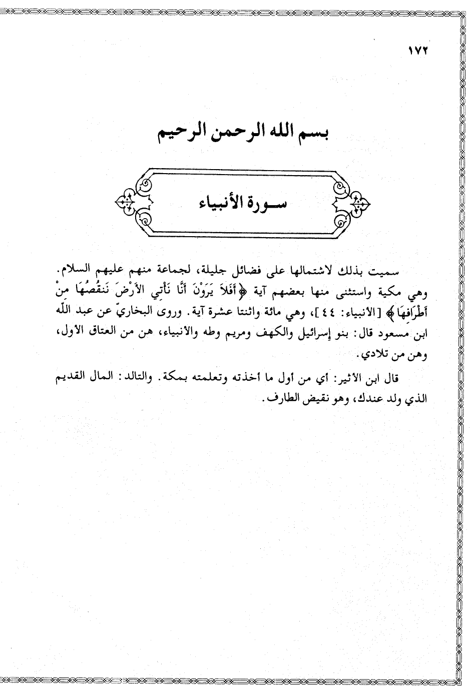 وهي مكية واستثنى منها بعضهم آية أَفَلا يَرَوْنَ أَنَّا نَأْتِي الْأَرْضَ نَنْقُصُها مِنْ أَطْرافِها [الأنبياء: 44] ، وهي مائة واثنتا عشرة آية. وروى البخاريّ عن عبد الله ابن مسعود قال: بنو إسرائيل والكهف ومريم وطه والأنبياء، هن من العتاق الأول، وهن من تلادي.