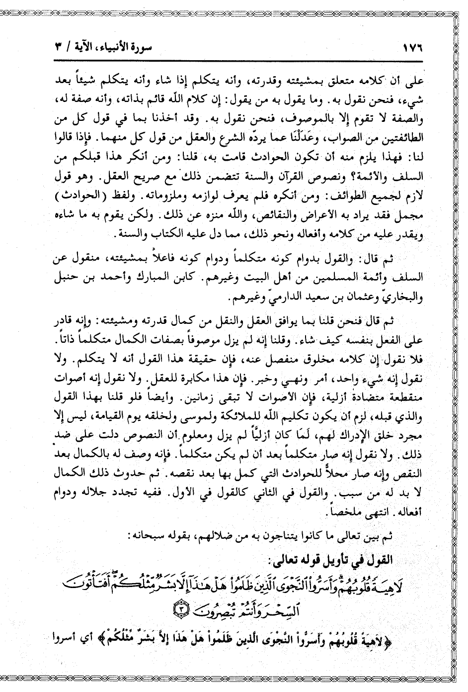 ثم قال: والقول بدوام كونه متكلما ودوام كونه فاعلا بمشيئته، منقول عن السلف وأئمة المسلمين من أهل البيت وغيرهم. كابن المبارك وأحمد بن حنبل والبخاريّ وعثمان بن سعيد الدارميّ وغيرهم.