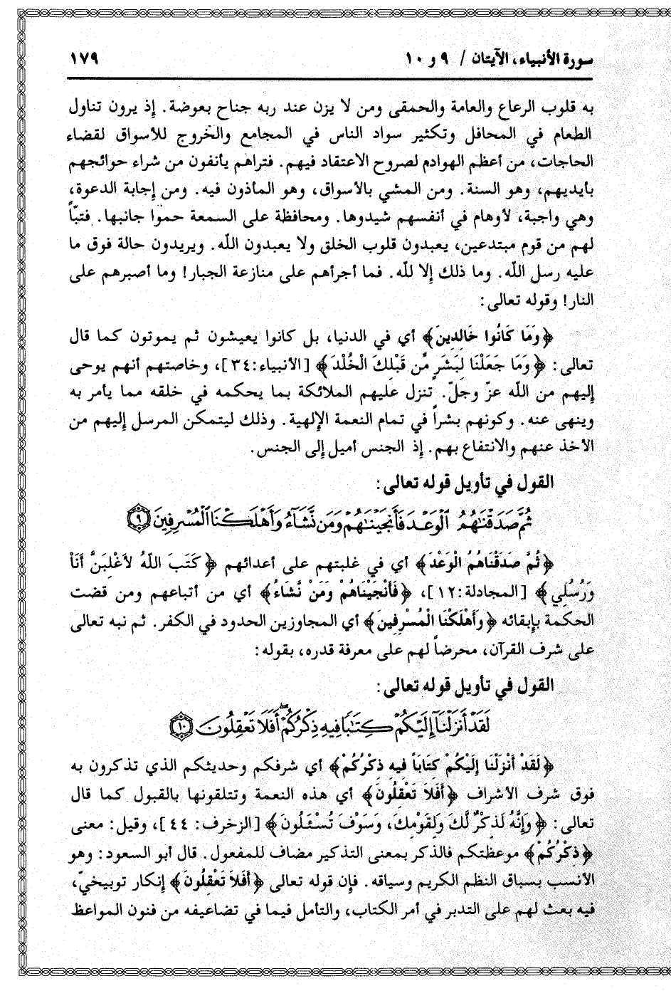 لَقَدْ أَنْزَلْنا إِلَيْكُمْ كِتاباً فِيهِ ذِكْرُكُمْ أي شرفكم وحديثكم الذي تذكرون به فوق شرف الأشراف أَفَلا تَعْقِلُونَ أي هذه النعمة وتتلقونها بالقبول كما قال تعالى: وَإِنَّهُ لَذِكْرٌ لَكَ وَلِقَوْمِكَ، وَسَوْفَ تُسْئَلُونَ [الزخرف: 44] ، وقيل: معنى ذِكْرُكُمْ موعظتكم فالذكر بمعنى التذكير مضاف للمفعول. قال أبو السعود: وهو الأنسب بسباق النظم الكريم وسياقه. فإن قوله تعالى أَفَلا تَعْقِلُونَ إنكار توبيخيّ، فيه بعث لهم على التدبر في أمر الكتاب، والتأمل فيما في تضاعيفه من فنون المواعظ