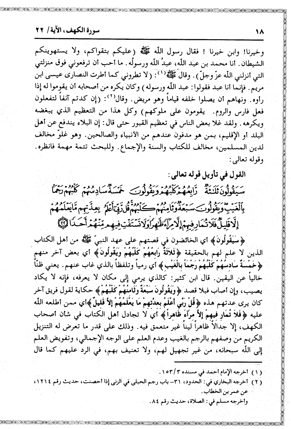 سَيَقُولُونَ ثَلاثَةٌ رابِعُهُمْ كَلْبُهُمْ وَيَقُولُونَ خَمْسَةٌ سادِسُهُمْ كَلْبُهُمْ رَجْماً بِالْغَيْبِ وَيَقُولُونَ سَبْعَةٌ وَثامِنُهُمْ كَلْبُهُمْ قُلْ رَبِّي أَعْلَمُ بِعِدَّتِهِمْ ما يَعْلَمُهُمْ إِلاَّ قَلِيلٌ فَلا تُمارِ فِيهِمْ إِلاَّ مِراءً ظاهِراً وَلا تَسْتَفْتِ فِيهِمْ مِنْهُمْ أَحَداً (22)