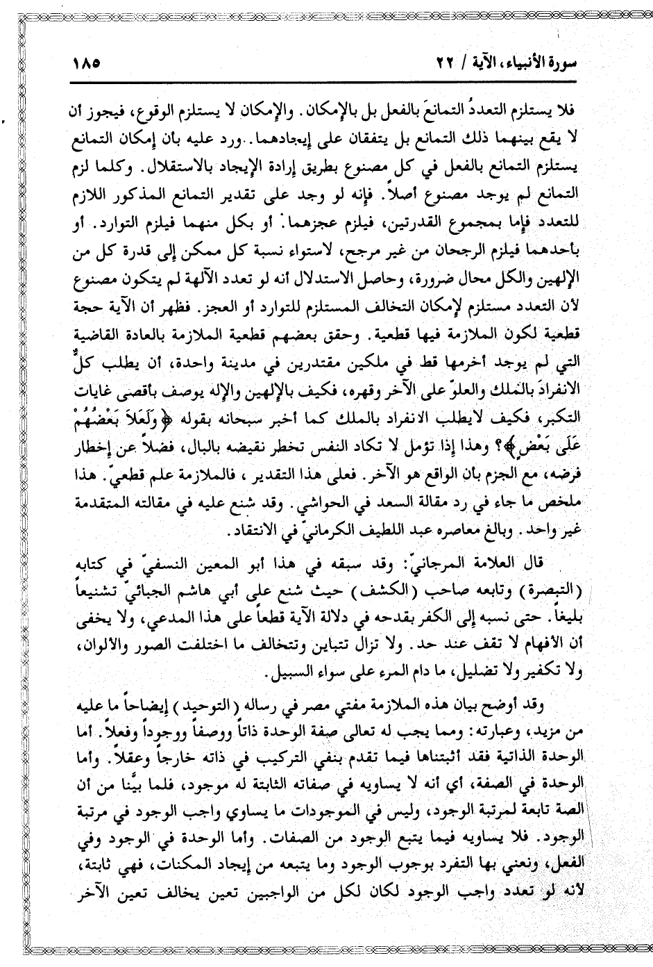 فلا يستلزم التعدد التمانع بالفعل بل بالإمكان. والإمكان لا يستلزم الوقوع، فيجوز أن لا يقع بينهما ذلك التمانع بل يتفقان على إيجادهما. ورد عليه بأن إمكان التمانع يستلزم التمانع بالفعل في كل مصنوع بطريق إرادة الإيجاد بالاستقلال. وكلما لزم التمانع لم يوجد مصنوع أصلا. فإنه لو وجد على تقدير التمانع المذكور اللازم للتعدد فإما بمجموع القدرتين، فيلزم عجزهما. أو بكل منهما فيلزم التوارد. أو بأحدهما فيلزم الرجحان من غير مرجح، لاستواء نسبة كل ممكن إلى قدرة كل من الإلهين والكل محال ضرورة، وحاصل الاستدلال أنه لو تعدد الآلهة لم يتكون مصنوع لأن التعدد مستلزم لإمكان التخالف المستلزم للتوارد أو العجز. فظهر أن الآية حجة قطعية لكون الملازمة فيها قطعية. وحقق بعضهم قطعية الملازمة بالعادة القاضية التي لم يوجد آخر منها قط في ملكين مقتدرين في مدينة واحدة، أن يطلب كلّ الانفراد بالملك والعلوّ على الآخر وقهره، فكيف بالإلهين والإله يوصف بأقصى غايات التكبر، فكيف لا يطلب الانفراد بالملك كما أخبر سبحانه بقوله وَلَعَلا بَعْضُهُمْ عَلى بَعْضٍ؟ وهذا إذا تؤمل لا تكاد النفس تخطر نقيضه بالبال، فضلا عن إخطار فرضه، مع الجزم بأن الواقع هو الآخر. فعلى هذا التقدير، فالملازمة علم قطعيّ. هذا ملخص ما جاء في رد مقالة السعد في الحواشي. وقد شنع عليه في مقالته المتقدمة غير واحد. وبالغ معاصره عبد اللطيف الكرمانيّ في الانتقاد.