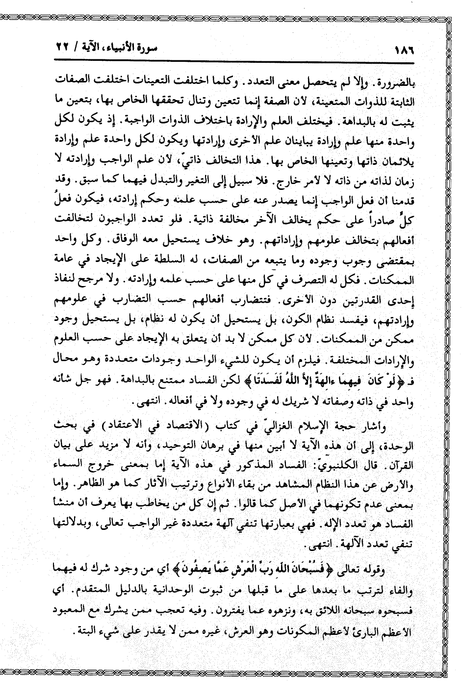وأشار حجة الإسلام الغزاليّ في كتاب (الاقتصاد في الاعتقاد) في بحث الوحدة، إلى أن هذه الآية لا أبين منها في برهان التوحيد، وأنه لا مزيد على بيان القرآن. قال الكلنبويّ: الفساد المذكور في هذه الآية إما بمعنى خروج السماء والأرض عن هذا النظام المشاهد من بقاء الأنواع وترتيب الآثار كما هو الظاهر. وإما بمعنى عدم تكونهما في الأصل كما قالوا. ثم إن كل من يخاطب بها يعرف أن منشأ الفساد هو تعدد الإله. فهي بعبارتها تنفي آلهة متعددة غير الواجب تعالى، وبدلالتها تنفي تعدد الآلهة. انتهى.