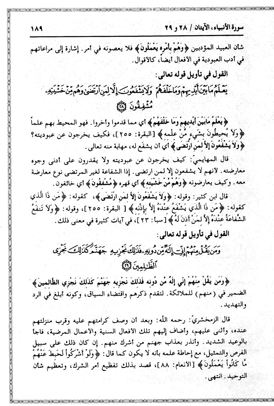 قال ابن كثير: وقوله: وَلا يَشْفَعُونَ إِلَّا لِمَنِ ارْتَضى، كقوله: مَنْ ذَا الَّذِي يَشْفَعُ عِنْدَهُ إِلَّا بِإِذْنِهِ [البقرة: 255] ، وقوله: وَلا تَنْفَعُ الشَّفاعَةُ عِنْدَهُ إِلَّا لِمَنْ أَذِنَ لَهُ [سبأ: 23] ، في آيات كثيرة في معنى ذلك.