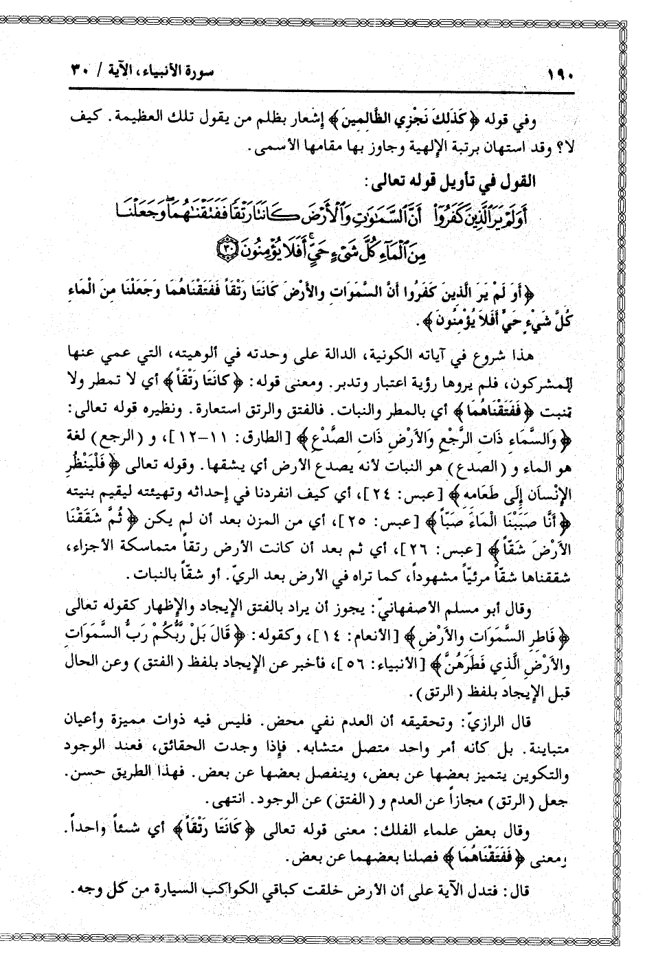 أَوَلَمْ يَرَ الَّذِينَ كَفَرُوا أَنَّ السَّماواتِ وَالْأَرْضَ كانَتا رَتْقاً فَفَتَقْناهُما وَجَعَلْنا مِنَ الْماءِ كُلَّ شَيْءٍ حَيٍّ أَفَلا يُؤْمِنُونَ (30)