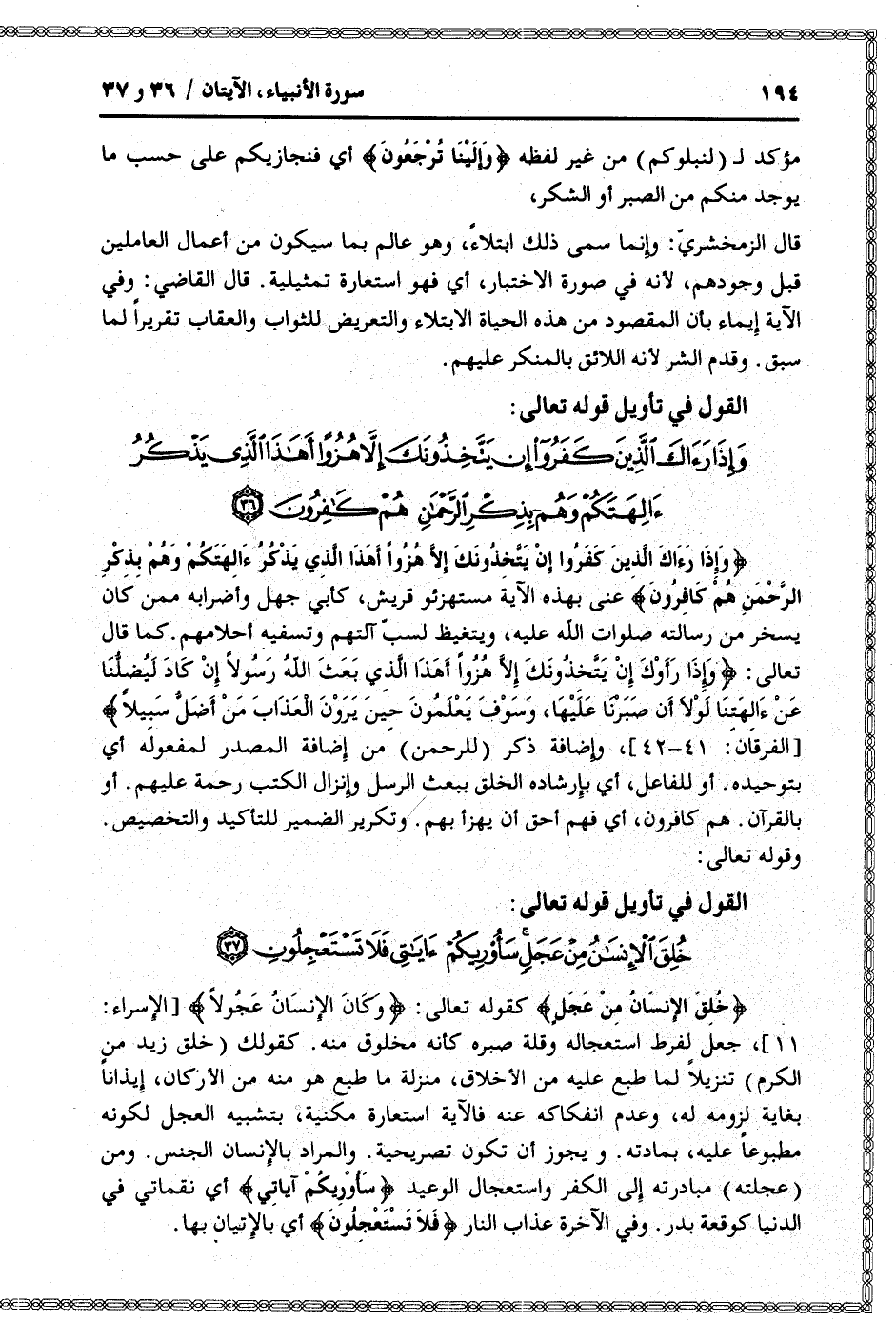 وَإِذا رَآكَ الَّذِينَ كَفَرُوا إِنْ يَتَّخِذُونَكَ إِلَّا هُزُواً أَهذَا الَّذِي يَذْكُرُ آلِهَتَكُمْ وَهُمْ بِذِكْرِ الرَّحْمنِ هُمْ كافِرُونَ عنى بهذه الآية مستهزئو قريش، كأبي جهل وأضرابه ممن كان يسخر من رسالته صلوات الله عليه، ويتغيظ لسبّ آلتهم وتسفيه أحلامهم. كما قال تعالى: وَإِذا رَأَوْكَ إِنْ يَتَّخِذُونَكَ إِلَّا هُزُواً أَهذَا الَّذِي بَعَثَ اللَّهُ رَسُولًا إِنْ كادَ لَيُضِلُّنا عَنْ آلِهَتِنا لَوْلا أَنْ صَبَرْنا عَلَيْها، وَسَوْفَ يَعْلَمُونَ حِينَ يَرَوْنَ الْعَذابَ مَنْ أَضَلُّ سَبِيلًا [الفرقان: 41- 42] ، وإضافة ذكر (للرحمن) من إضافة المصدر لمفعوله أي بتوحيده. أو للفاعل، أي بإرشاده الخلق ببعث الرسل وإنزال الكتب رحمة عليهم. أو بالقرآن. هم كافرون، أي فهم أحق أن يهزأ بهم. وتكرير الضمير للتأكيد والتخصيص.