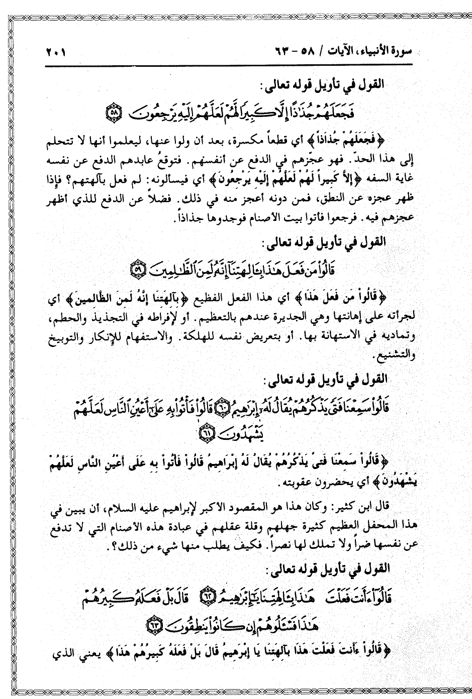 قالُوا أَأَنْتَ فَعَلْتَ هذا بِآلِهَتِنا يا إِبْراهِيمُ (62) قالَ بَلْ فَعَلَهُ كَبِيرُهُمْ هذا فَسْئَلُوهُمْ إِنْ كانُوا يَنْطِقُونَ (63)