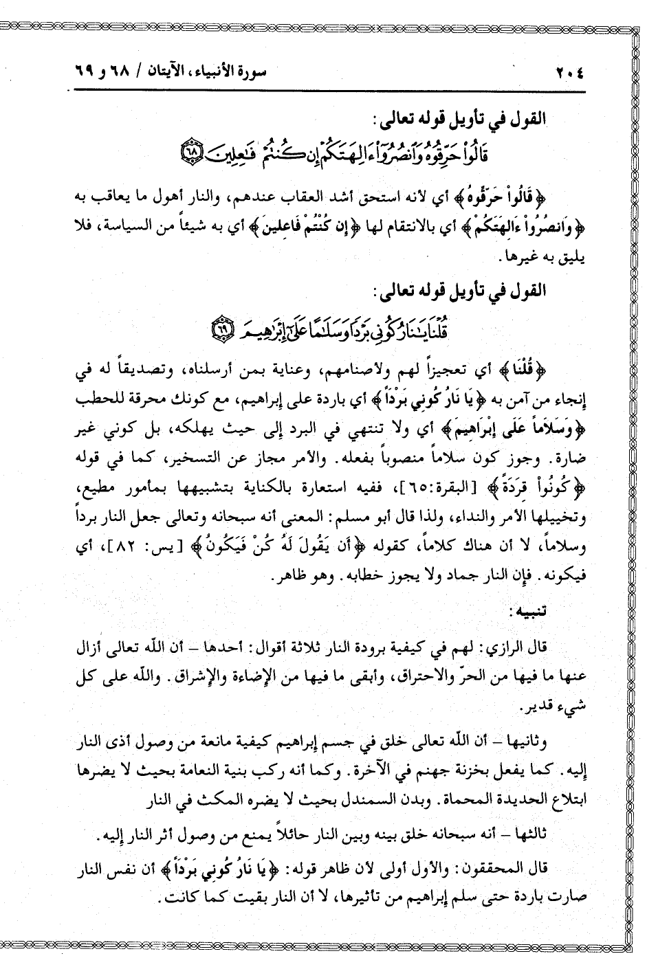 قال المحققون: والأول أولى لأن ظاهر قوله: يا نارُ كُونِي بَرْداً أن نفس النار صارت باردة حتى سلم إبراهيم من تأثيرها، لا أن النار بقيت كما كانت.