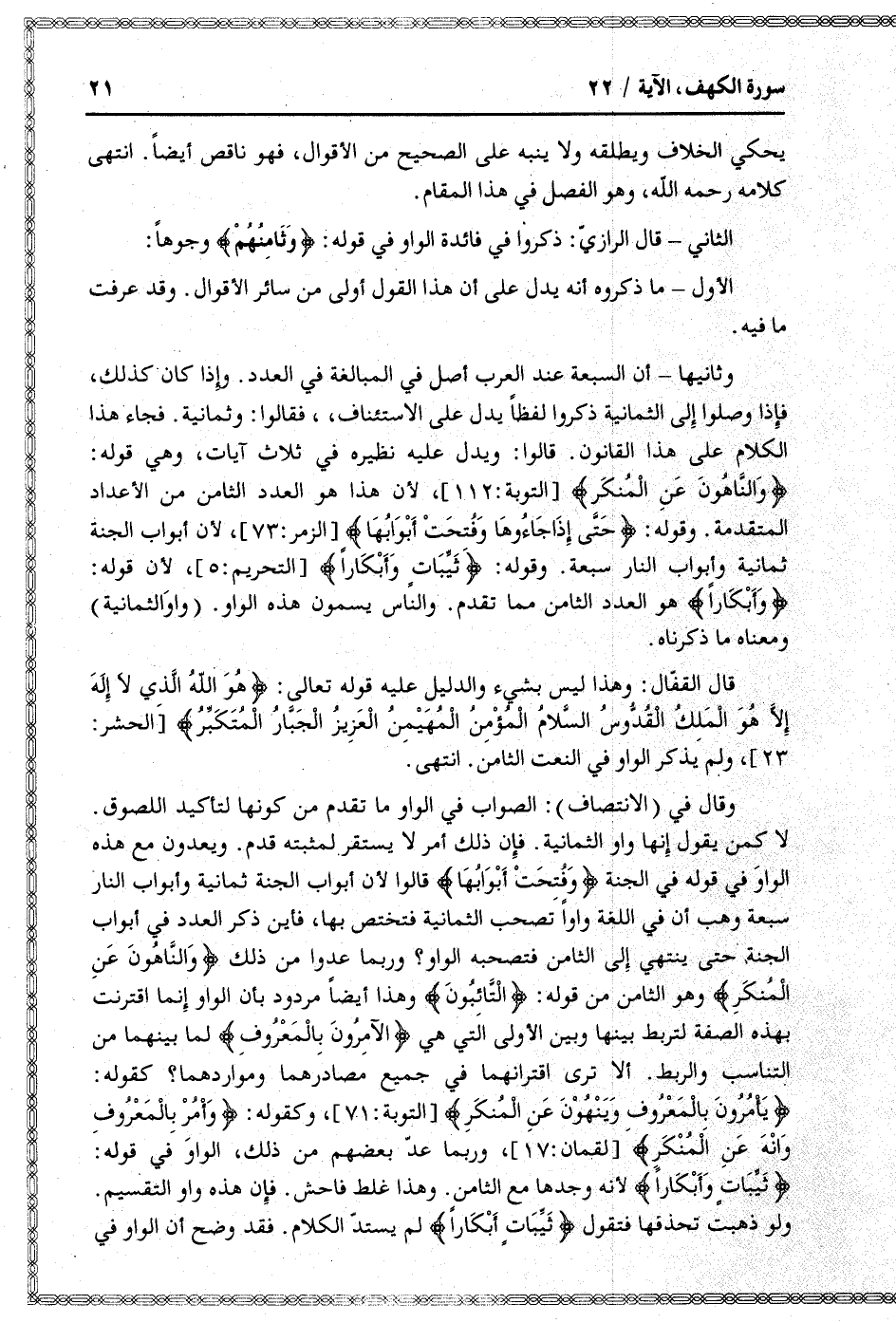 الثاني- قال الرازيّ: ذكروا في فائدة الواو في قوله: وَثامِنُهُمْ وجوها: