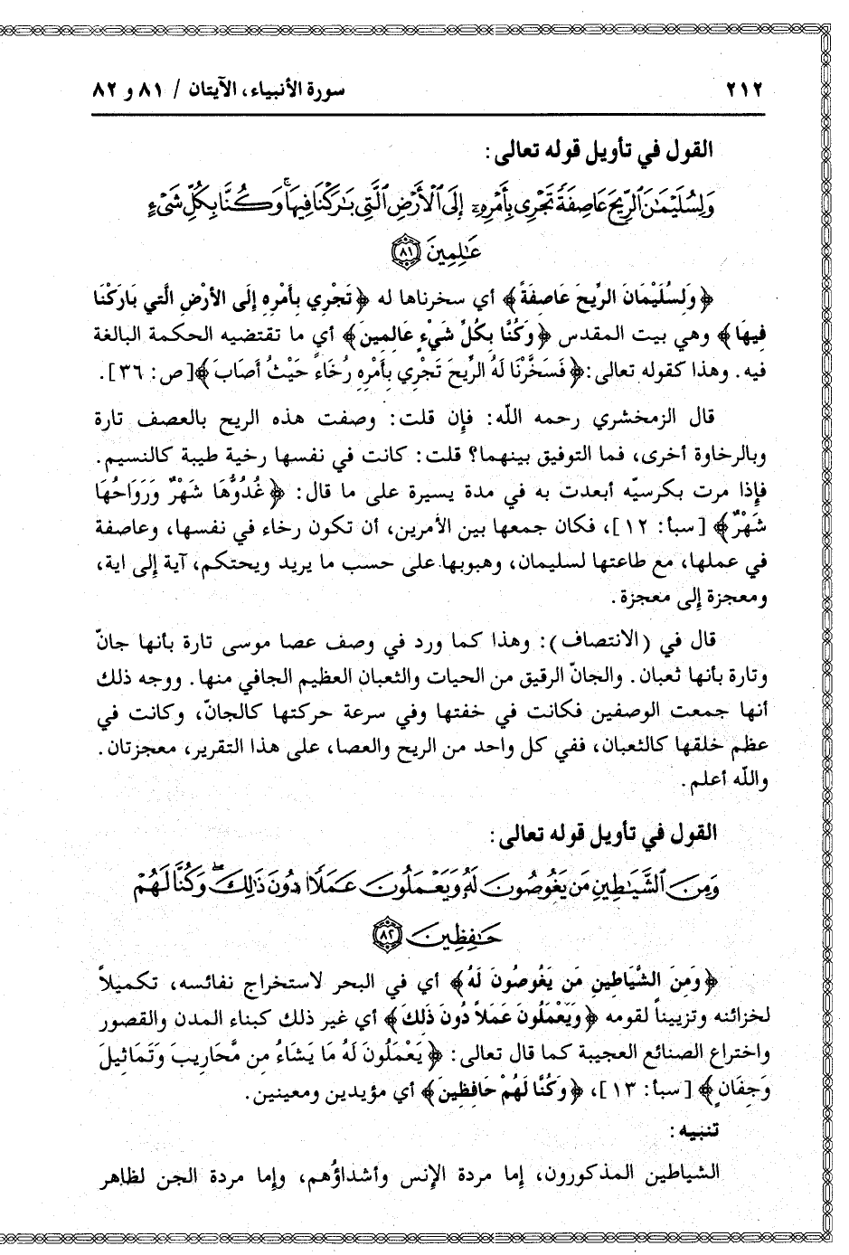 وَلِسُلَيْمانَ الرِّيحَ عاصِفَةً أي سخرناها له تَجْرِي بِأَمْرِهِ إِلى الْأَرْضِ الَّتِي بارَكْنا فِيها وهي بيت المقدس وَكُنَّا بِكُلِّ شَيْءٍ عالِمِينَ أي ما تقتضيه الحكمة البالغة فيه. وهذا كقوله تعالى: فَسَخَّرْنا لَهُ الرِّيحَ تَجْرِي بِأَمْرِهِ رُخاءً حَيْثُ أَصابَ [ص: 36] .