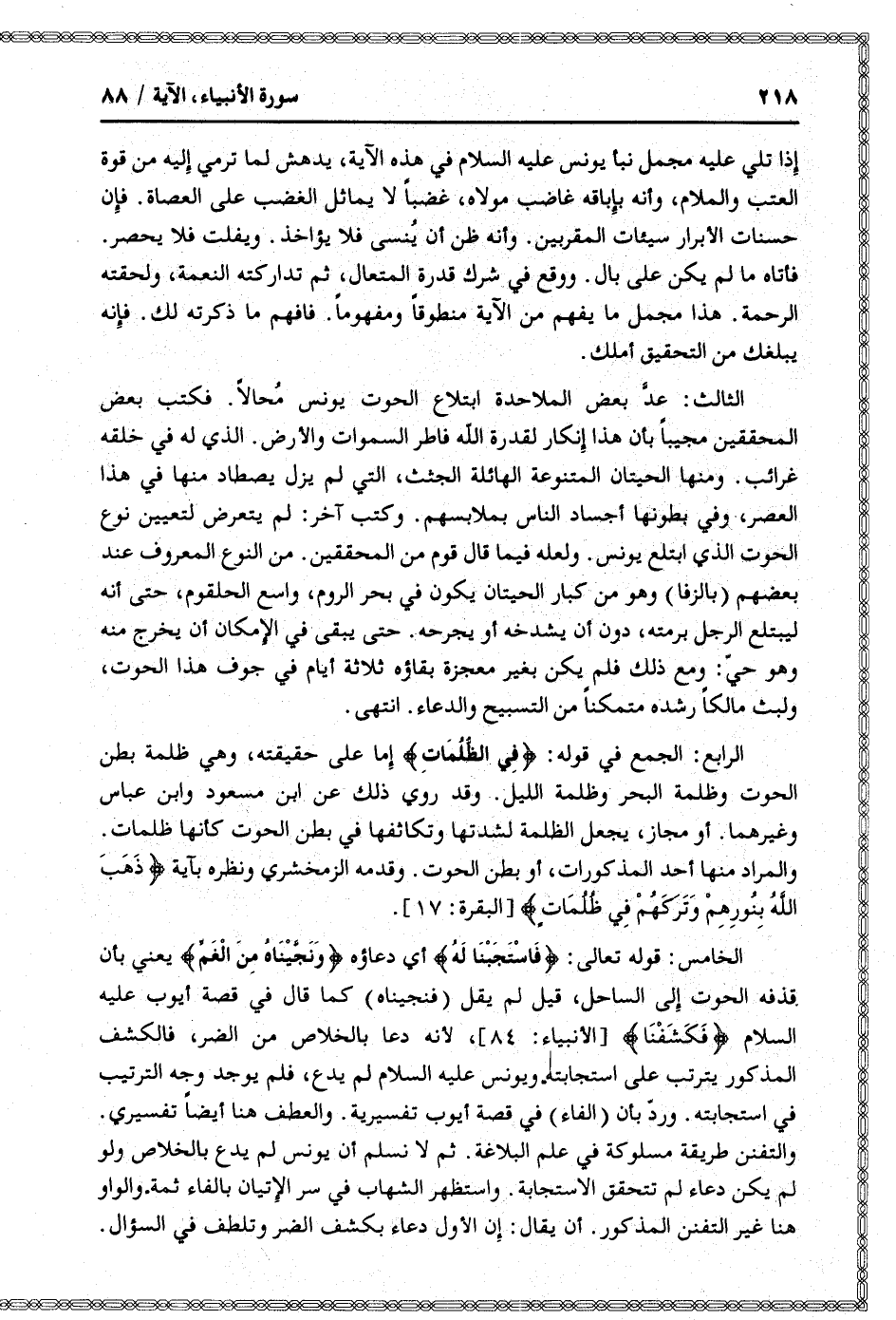 الرابع: الجمع في قوله: فِي الظُّلُماتِ إما على حقيقته، وهي ظلمة بطن الحوت وظلمة البحر وظلمة الليل. وقد روي ذلك عن ابن مسعود وابن عباس وغيرهما. أو مجاز، يجعل الظلمة لشدتها وتكاثفها في بطن الحوت كأنها ظلمات.