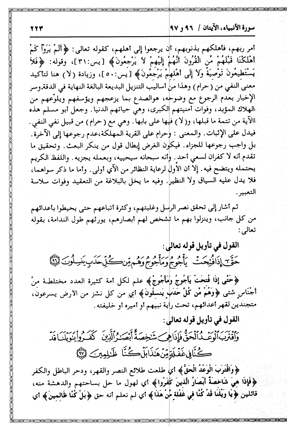 حَتَّى إِذا فُتِحَتْ يَأْجُوجُ وَمَأْجُوجُ علم لكل أمة كثيرة العدد مختلطة من أجناس شتى وَهُمْ مِنْ كُلِّ حَدَبٍ يَنْسِلُونَ أي من كل نشز من الأرض يسرعون، متجندين لقهر أعدائهم، تحت راية نبيهم أو أميره أو خليفته.