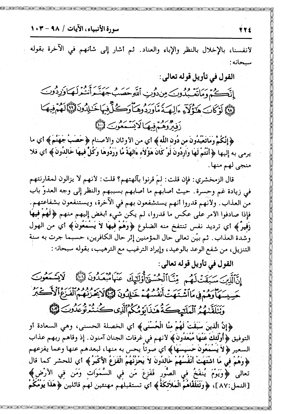 إِنَّكُمْ وَما تَعْبُدُونَ مِنْ دُونِ اللَّهِ حَصَبُ جَهَنَّمَ أَنْتُمْ لَها وارِدُونَ (98) لَوْ كانَ هؤُلاءِ آلِهَةً ما وَرَدُوها وَكُلٌّ فِيها خالِدُونَ (99) لَهُمْ فِيها زَفِيرٌ وَهُمْ فِيها لا يَسْمَعُونَ (100)