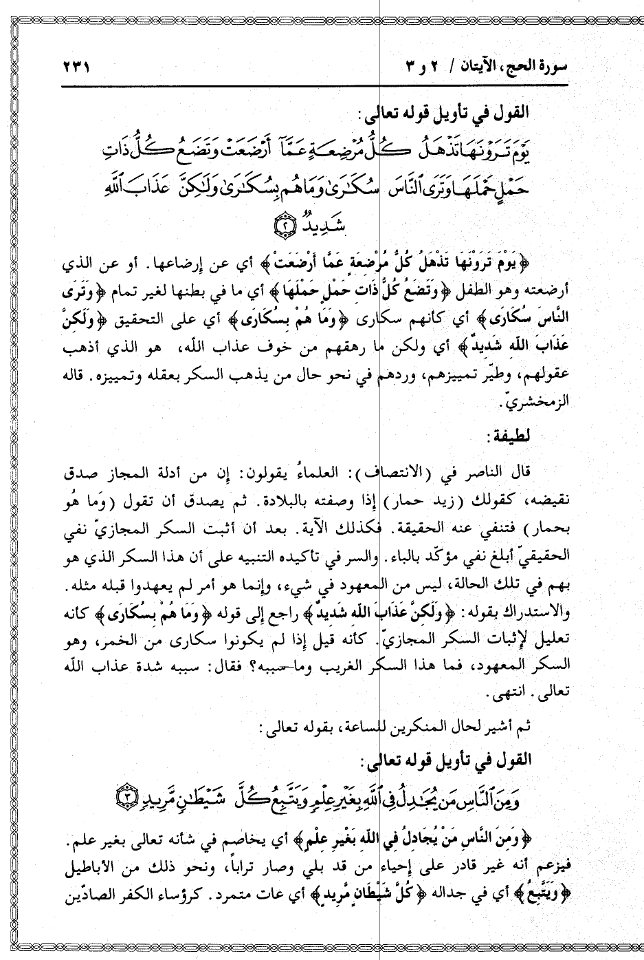 يَوْمَ تَرَوْنَها تَذْهَلُ كُلُّ مُرْضِعَةٍ عَمَّا أَرْضَعَتْ وَتَضَعُ كُلُّ ذاتِ حَمْلٍ حَمْلَها وَتَرَى النَّاسَ سُكارى وَما هُمْ بِسُكارى وَلكِنَّ عَذابَ اللَّهِ شَدِيدٌ (2)