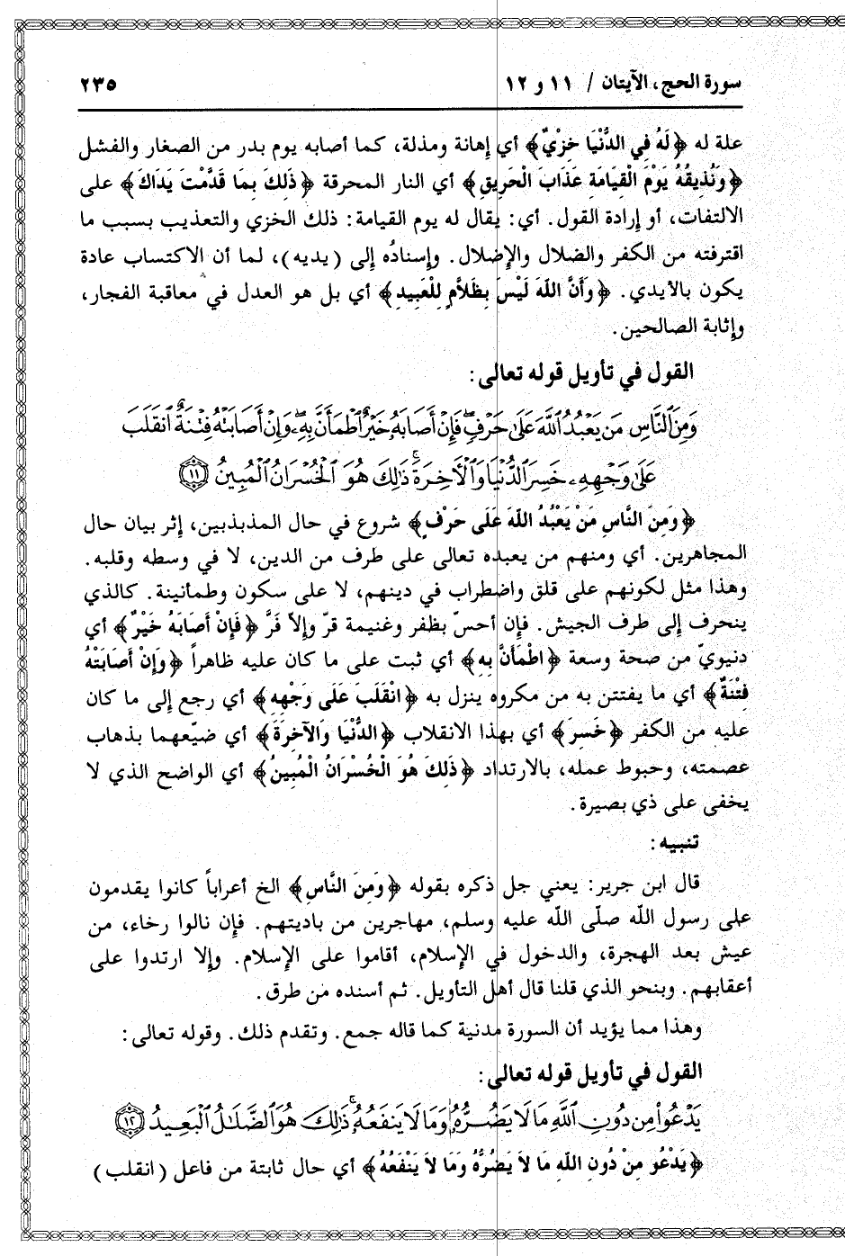 وَمِنَ النَّاسِ مَنْ يَعْبُدُ اللَّهَ عَلى حَرْفٍ فَإِنْ أَصابَهُ خَيْرٌ اطْمَأَنَّ بِهِ وَإِنْ أَصابَتْهُ فِتْنَةٌ انْقَلَبَ عَلى وَجْهِهِ خَسِرَ الدُّنْيا وَالْآخِرَةَ ذلِكَ هُوَ الْخُسْرانُ الْمُبِينُ (11)