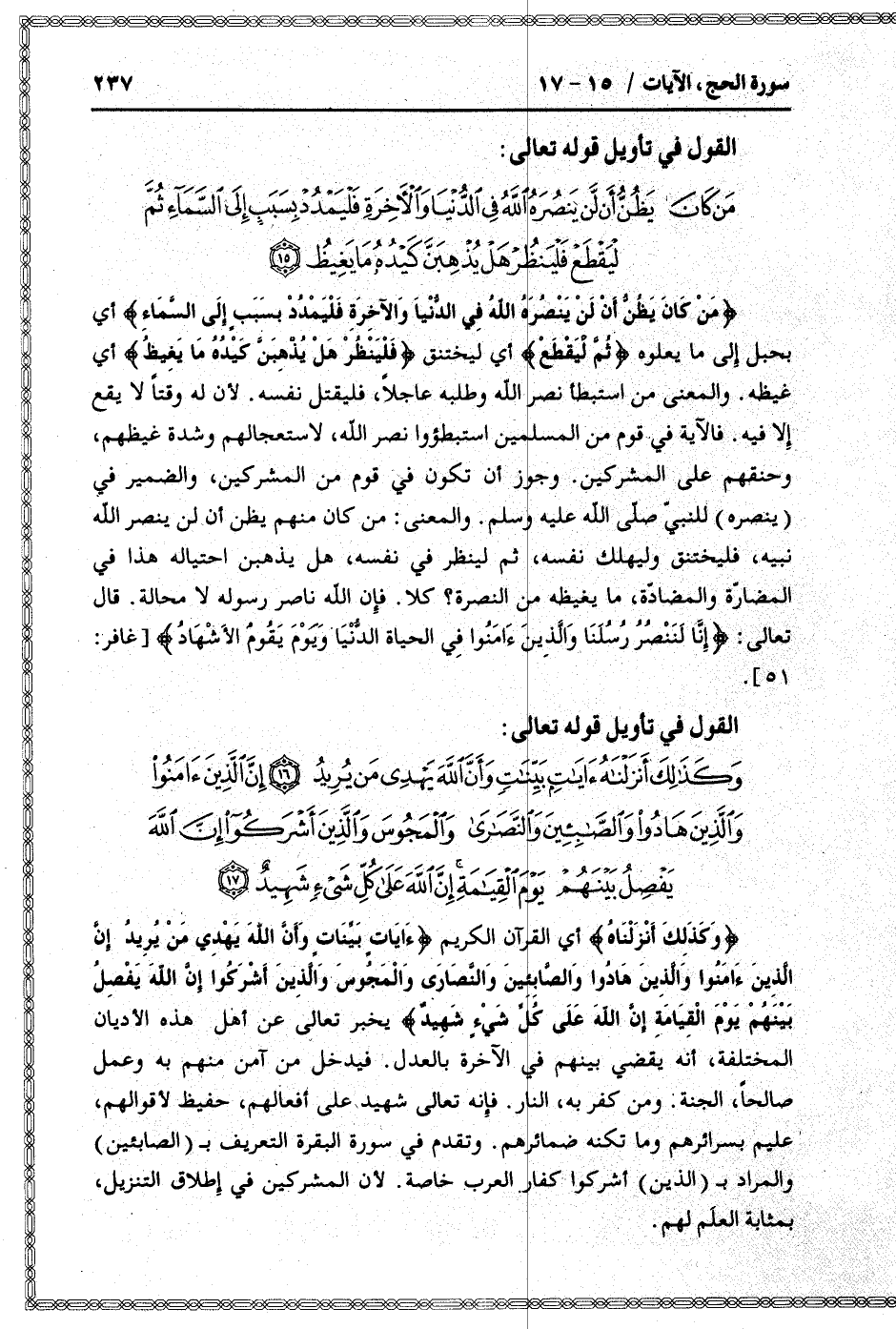 مَنْ كانَ يَظُنُّ أَنْ لَنْ يَنْصُرَهُ اللَّهُ فِي الدُّنْيا وَالْآخِرَةِ فَلْيَمْدُدْ بِسَبَبٍ إِلَى السَّماءِ ثُمَّ لْيَقْطَعْ فَلْيَنْظُرْ هَلْ يُذْهِبَنَّ كَيْدُهُ ما يَغِيظُ (15)