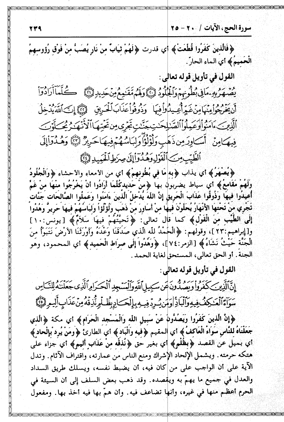 إِنَّ الَّذِينَ كَفَرُوا وَيَصُدُّونَ عَنْ سَبِيلِ اللَّهِ وَالْمَسْجِدِ الْحَرامِ أي مكة الَّذِي جَعَلْناهُ لِلنَّاسِ سَواءً الْعاكِفُ أي المقيم فِيهِ وَالْبادِ أي الطارئ وَمَنْ يُرِدْ فِيهِ بِإِلْحادٍ أي بميل عن القصد بِظُلْمٍ أي بغير حق نُذِقْهُ مِنْ عَذابٍ أَلِيمٍ أي جزاء على هتكه حرمته. ويشمل الإلحاد الإشراك ومنع الناس من عمارته، واقتراف الآثام. وتدل الآية على أن الواجب على من كان فيه، أن يضبط نفسه، ويسلك طريق السداد والعدل في جميع ما يهمّ به ويقصده. وقد ذهب بعض السلف إلى أن السيئة في الحرم أعظم منها في غيره، وأنها تضاعف فيه. وأن همّ بها فيه أخذ بها. ومفعول