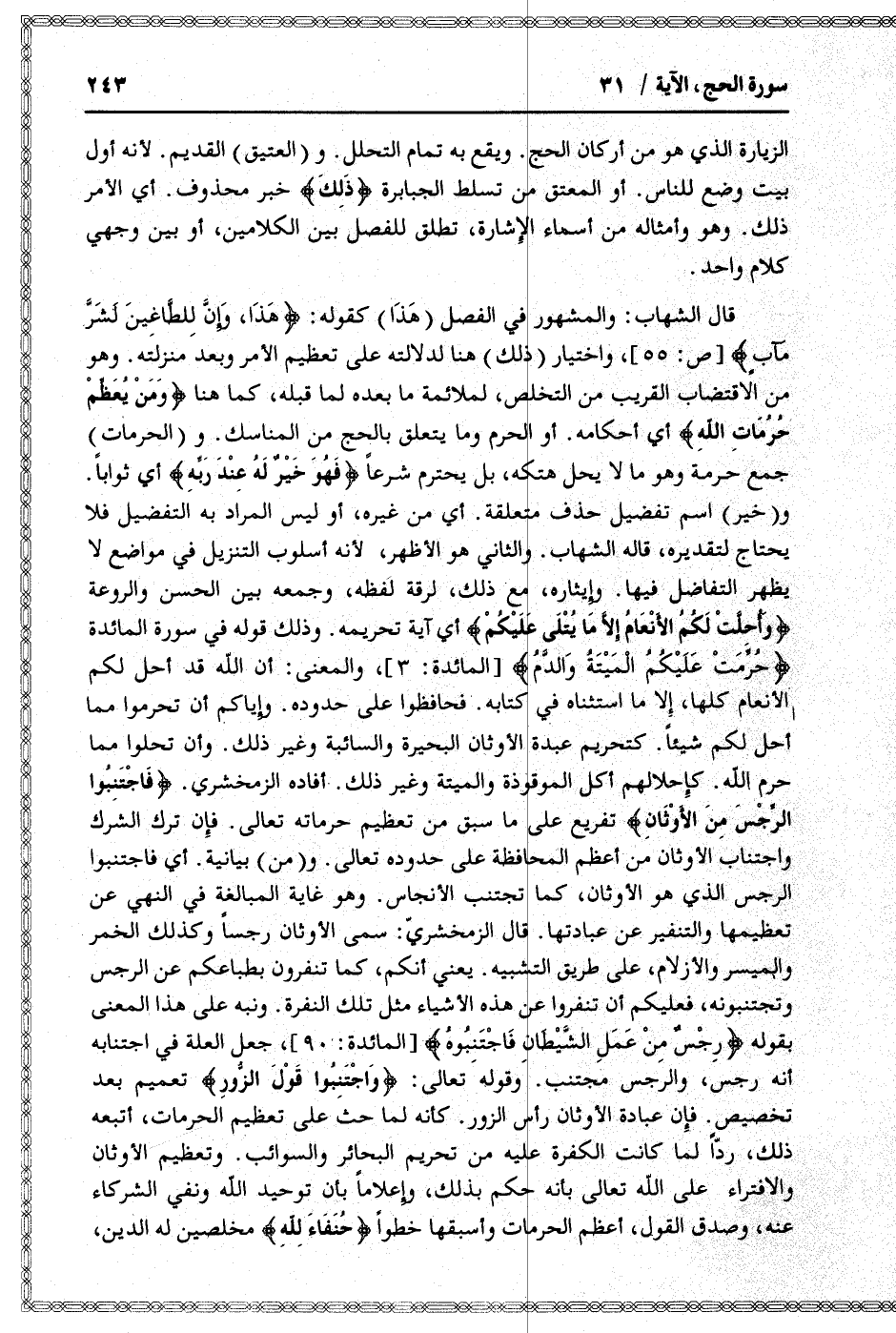 و (خير) اسم تفضيل حذف متعلقة. أي من غيره، أو ليس المراد به التفضيل فلا يحتاج لتقديره، قاله الشهاب. والثاني هو الأظهر، لأنه أسلوب التنزيل في مواضع لا يظهر التفاضل فيها. وإيثاره، مع ذلك، لرقة لفظه، وجمعه بين الحسن والروعة وَأُحِلَّتْ لَكُمُ الْأَنْعامُ إِلَّا ما يُتْلى عَلَيْكُمْ أي آية تحريمه. وذلك قوله في سورة المائدة حُرِّمَتْ عَلَيْكُمُ الْمَيْتَةُ وَالدَّمُ [المائدة: 3] ، والمعنى: أن الله قد أحل لكم الأنعام كلها، إلا ما استثناه في كتابه. فحافظوا على حدوده. وإياكم أن تحرموا مما أحل لكم شيئا. كتحريم عبدة الأوثان البحيرة والسائبة وغير ذلك. وأن تحلوا مما حرم الله. كإحلالهم أكل الموقوذة والميتة وغير ذلك. أفاده الزمخشري. فَاجْتَنِبُوا الرِّجْسَ مِنَ الْأَوْثانِ تفريع على ما سبق من تعظيم حرماته تعالى. فإن ترك الشرك واجتناب الأوثان من أعظم المحافظة على حدوده تعالى. و (من) بيانية. أي فاجتنبوا الرجس الذي هو الأوثان، كما تجتنب الأنجاس. وهو غاية المبالغة في النهي عن تعظيمها والتنفير عن عبادتها. قال الزمخشريّ: سمى الأوثان رجسا وكذلك الخمر والميسر والأزلام، على طريق التشبيه. يعني أنكم، كما تنفرون بطباعكم عن الرجس وتجتنبونه، فعليكم أن تنفروا عن هذه الأشياء مثل تلك النفرة. ونبه على هذا المعنى بقوله رِجْسٌ مِنْ عَمَلِ الشَّيْطانِ فَاجْتَنِبُوهُ [المائدة: 90] ، جعل العلة في اجتنابه أنه رجس، والرجس مجتنب. وقوله تعالى: وَاجْتَنِبُوا قَوْلَ الزُّورِ تعميم بعد تخصيص. فإن عبادة الأوثان رأس الزور. كأنه لما حث على تعظيم الحرمات، أتبعه ذلك، ردّا لما كانت الكفرة عليه من تحريم البحائر والسوائب. وتعظيم الأوثان والافتراء على الله تعالى بأنه حكم بذلك، وإعلاما بأن توحيد الله ونفي الشركاء عنه، وصدق القول، أعظم الحرمات وأسبقها خطوا حُنَفاءَ لِلَّهِ مخلصين له الدين،