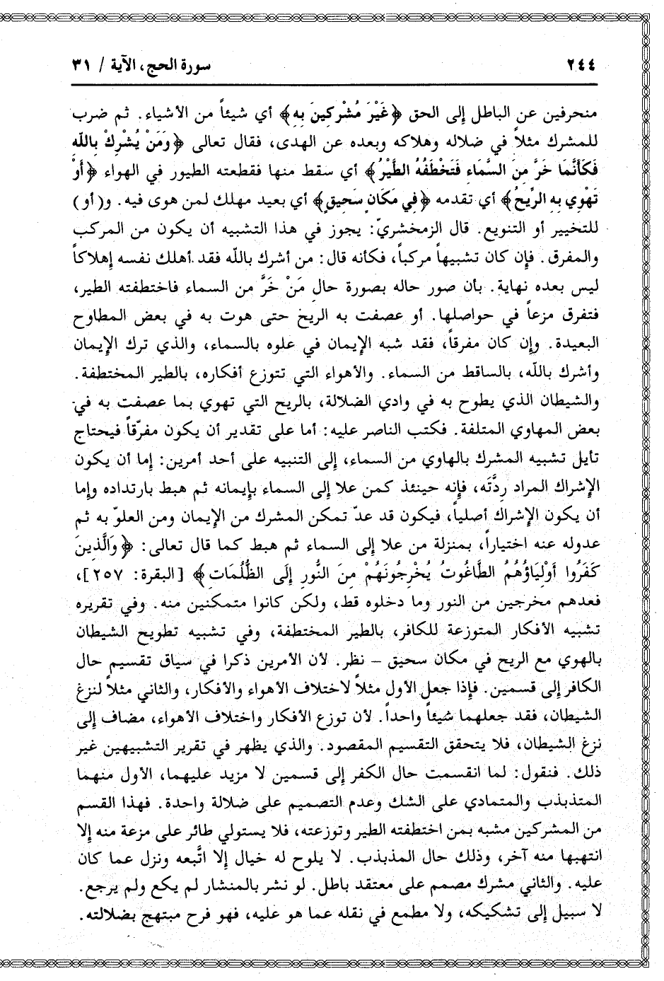 والشيطان الذي يطوح به في وادي الضلالة، بالريح التي تهوي بما عصفت به في بعض المهاوي المتلفة. فكتب الناصر عليه: أما على تقدير أن يكون مفرّقا فيحتاج تأويل تشبيه المشرك بالهاوي من السماء، إلى التنبيه على أحد أمرين: إما أن يكون الإشراك المراد ردّته، فإنه حينئذ كمن علا إلى السماء بإيمانه ثم هبط بارتداده وإما أن يكون الإشراك أصليا، فيكون قد عدّ تمكن المشرك من الإيمان ومن العلوّ به ثم عدوله عنه اختيارا، بمنزلة من علا إلى السماء ثم هبط كما قال تعالى: وَالَّذِينَ كَفَرُوا أَوْلِياؤُهُمُ الطَّاغُوتُ يُخْرِجُونَهُمْ مِنَ النُّورِ إِلَى الظُّلُماتِ [البقرة: 257] ، فعدهم مخرجين من النور وما دخلوه قط، ولكن كانوا متمكنين منه. وفي تقريره تشبيه الأفكار المتوزعة للكافر، بالطير المختطفة، وفي تشبيه تطويح الشيطان بالهوي مع الريح في مكان سحيق- نظر. لأن الأمرين ذكرا في سياق تقسيم حال الكافر إلى قسمين. فإذا جعل الأول مثلا لاختلاف الأهواء والأفكار، والثاني مثلا لنزغ الشيطان، فقد جعلهما شيئا واحدا. لأن توزع الأفكار واختلاف الأهواء، مضاف إلى نزغ الشيطان، فلا يتحقق التقسيم المقصود. والذي يظهر في تقرير التشبيهين غير ذلك. فنقول: لما انقسمت حال الكفر إلى قسمين لا مزيد عليهما، الأول منهما المتذبذب والمتمادي على الشك وعدم التصميم على ضلالة واحدة. فهذا القسم من المشركين مشبه بمن اختطفته الطير وتوزعته، فلا يستولي طائر على مزعة منه إلا انتهبها منه آخر، وذلك حال المذبذب. لا يلوح له خيال إلا اتّبعه ونزل عما كان عليه. والثاني مشرك مصمم على معتقد باطل. لو نشر بالمنشار لم يكع ولم يرجع.