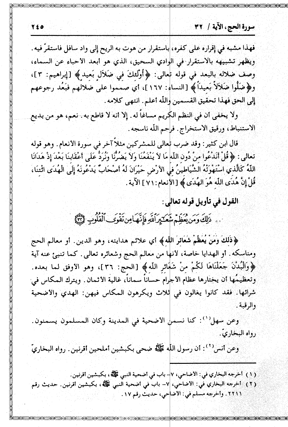 (2) أخرجه البخاري في: الأضاحي، 7- باب في أضحية النبي صلى الله عليه وسلم، بكبشين أقرنين. حديث رقم 2211. وأخرجه مسلم في: الأضاحي، حديث رقم 17.