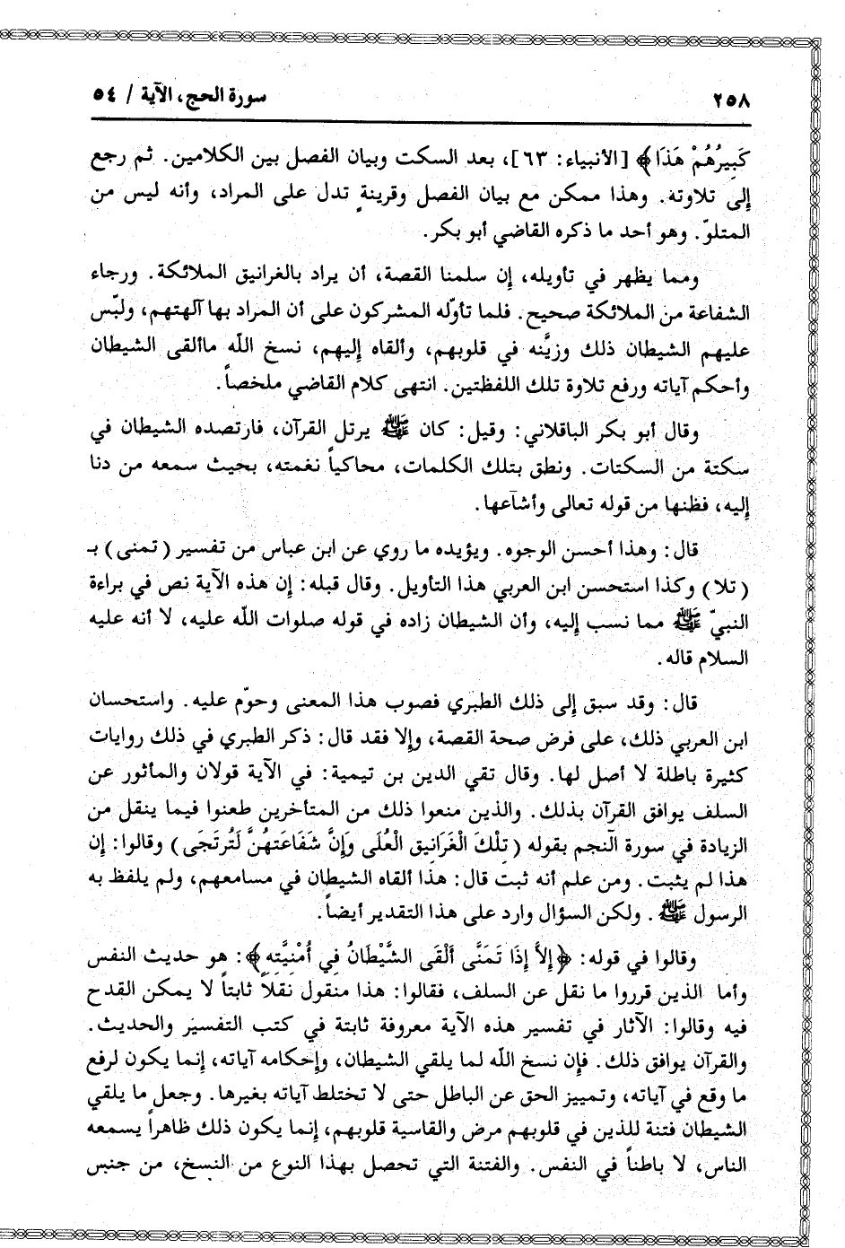 قال: وقد سبق إلى ذلك الطبري فصوب هذا المعنى وحوّم عليه. واستحسان ابن العربي ذلك، على فرض صحة القصة، وإلا فقد قال: ذكر الطبري في ذلك روايات كثيرة باطلة لا أصل لها. وقال تقي الدين بن تيمية: في الآية قولان والمأثور عن السلف يوافق القرآن بذلك. والذين منعوا ذلك من المتأخرين طعنوا فيما ينقل من الزيادة في سورة النجم بقوله (تلك الغرانيق العلى وإنّ شفاعتهنّ لترتجى) وقالوا: إن هذا لم يثبت. ومن علم أنه ثبت قال: هذا ألقاه الشيطان في مسامعهم، ولم يلفظ به الرسول صلى الله عليه وسلم. ولكن السؤال وارد على هذا التقدير أيضا.