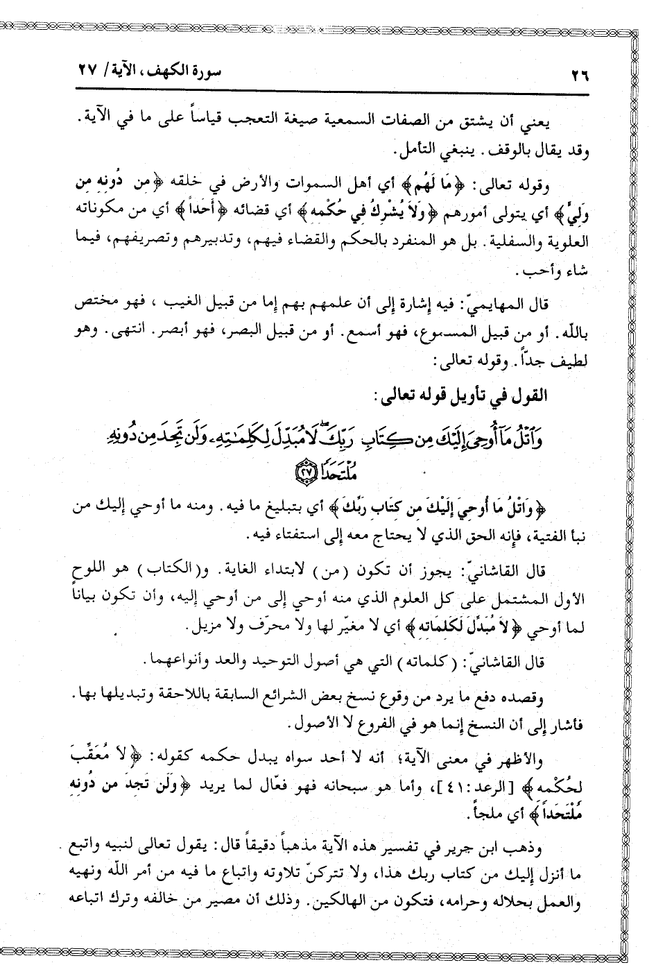 وَاتْلُ ما أُوحِيَ إِلَيْكَ مِنْ كِتابِ رَبِّكَ لا مُبَدِّلَ لِكَلِماتِهِ وَلَنْ تَجِدَ مِنْ دُونِهِ مُلْتَحَداً (27)